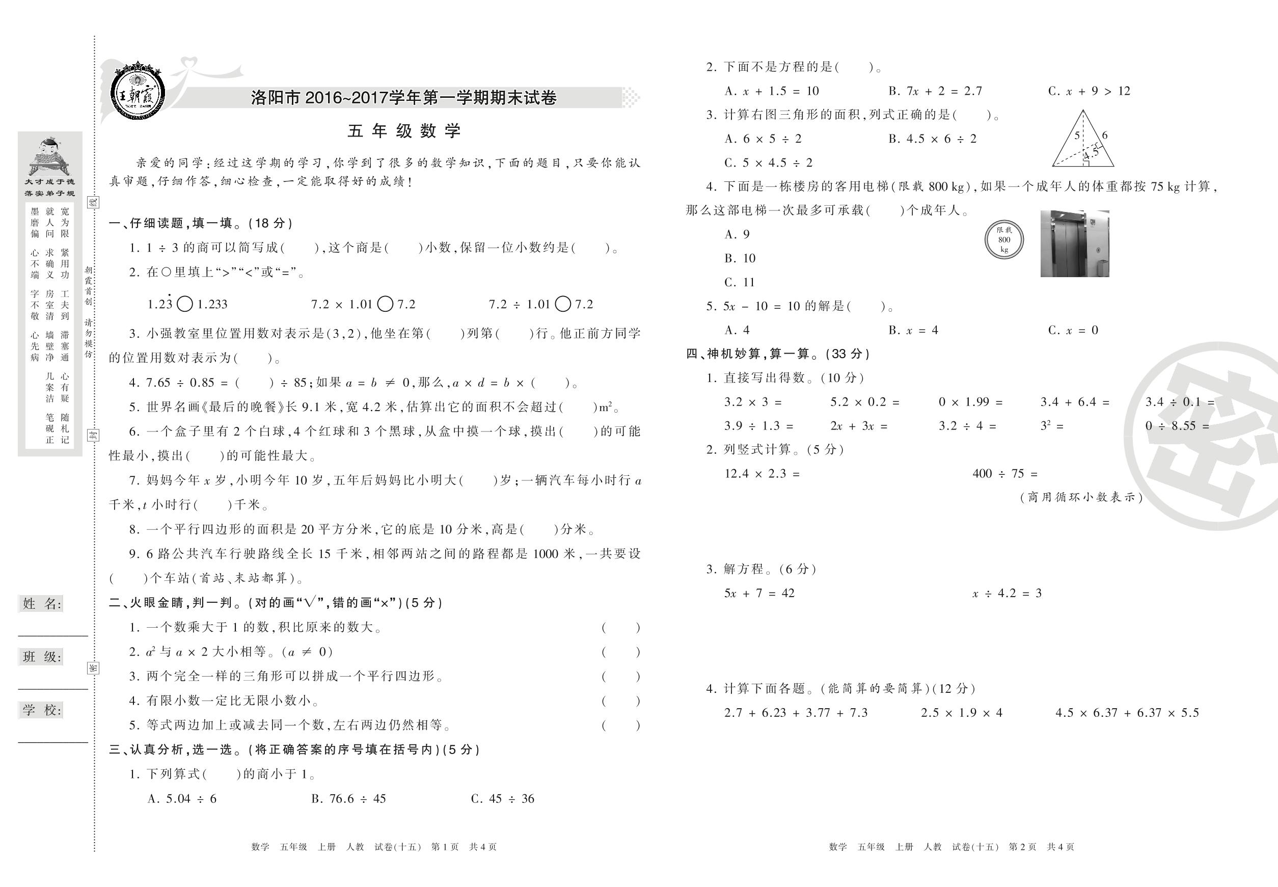 2016-2017学年第一学期洛阳市五年级数学试卷(人教版)【15】
