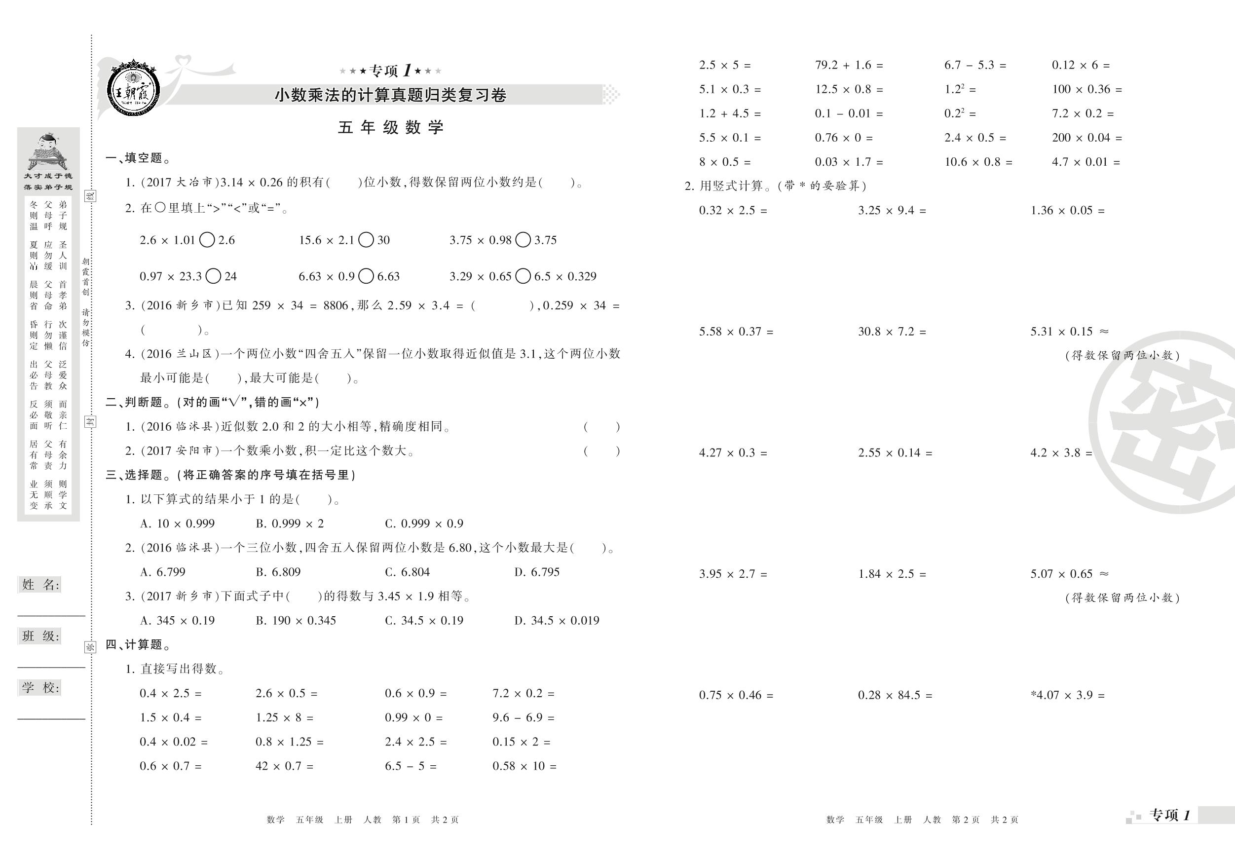 王朝霞期末专项卷——小数乘法的计算、运算律及小数乘法的实际应用真题归类复习卷五年级上册数学(人教版)_R210804184150【0】