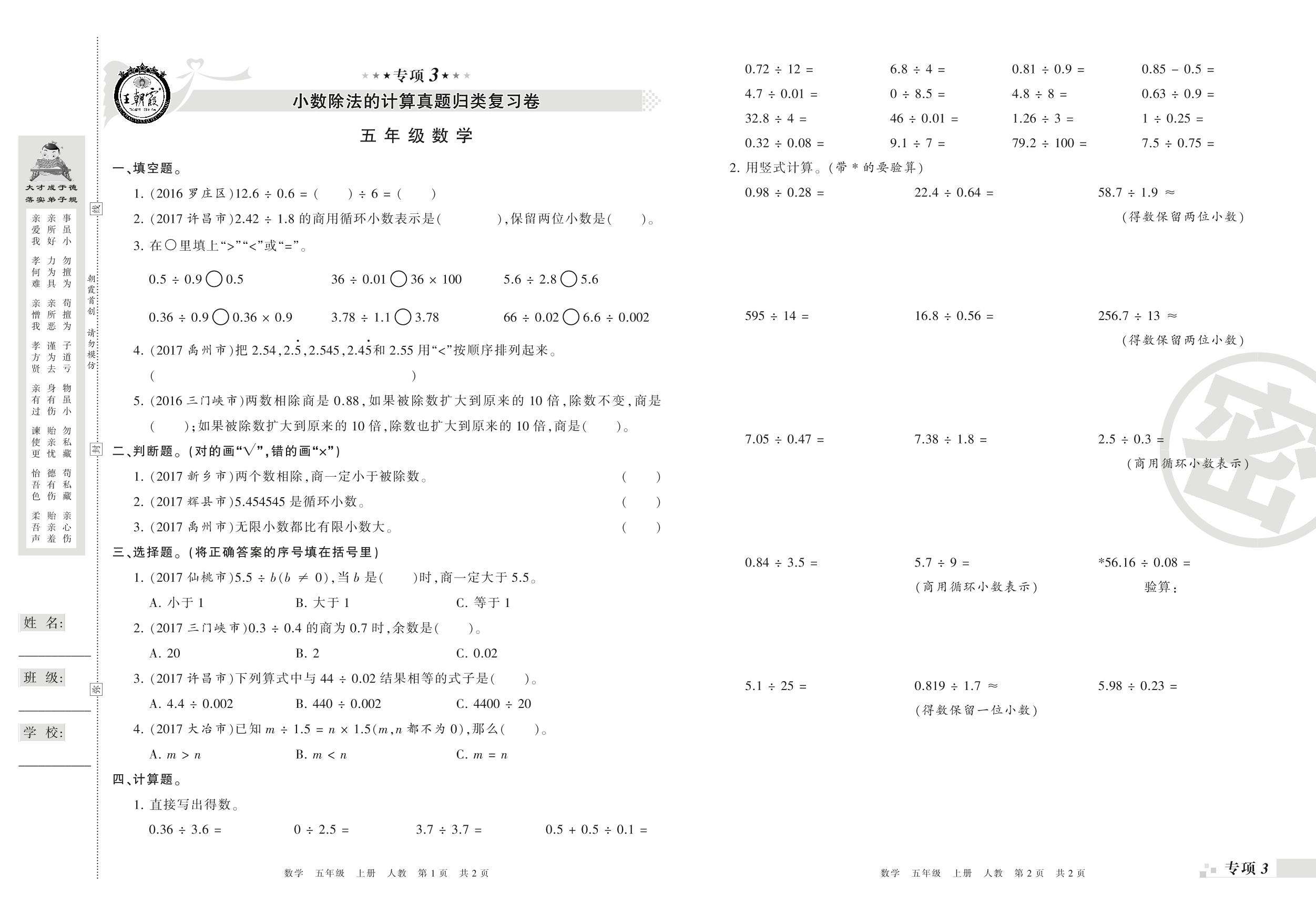 王朝霞期末专项卷——小数除法的计算、混合运算及小数除法的实际应用真题归类复习卷五年级上册数学(人教版)_R210804184155【0】