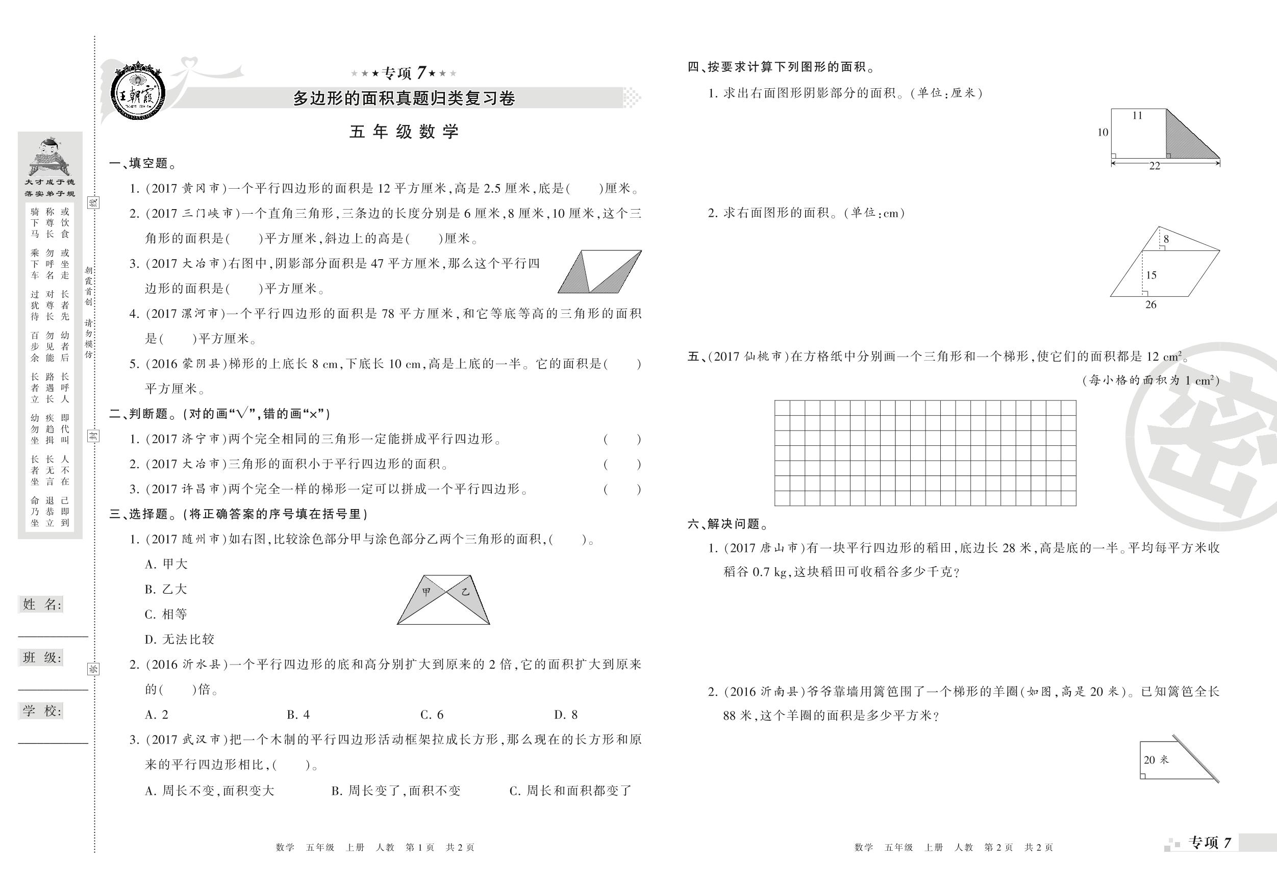 王朝霞期末专项卷——多边形的面积、位置、可能性及数学广角:植树问题真题归类复习卷五年级上册数学(人教版)_R210804184200【0】
