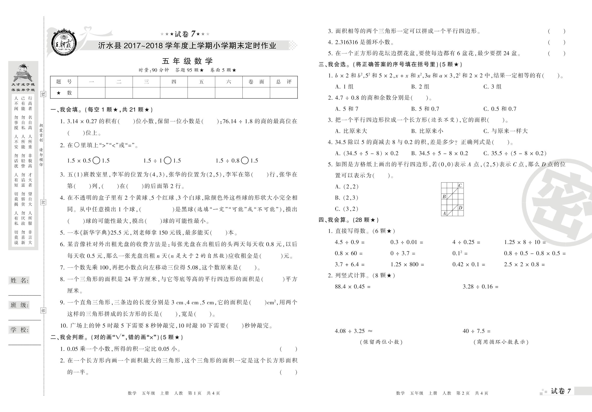 2017-2018学年第一学期临沂市沂水县五年级数学试卷(人教版)【7】