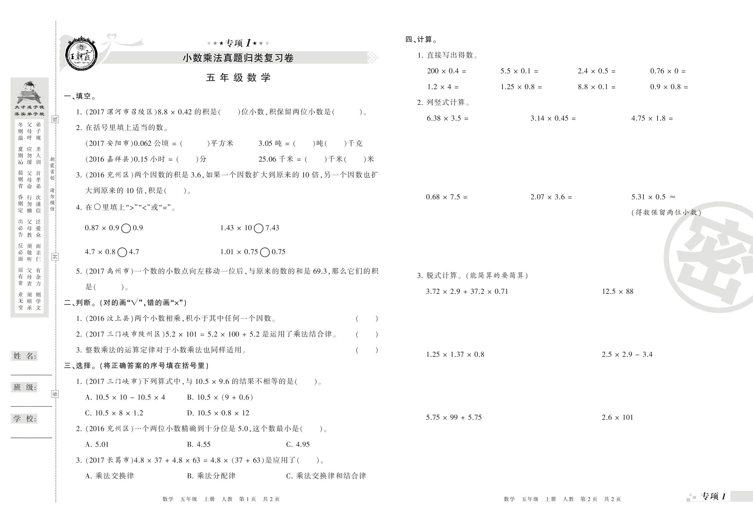 王朝霞期末专项卷——小数乘法、小数除法真题归类复习卷五年级上册数学(人教版)_R210804184400【0】