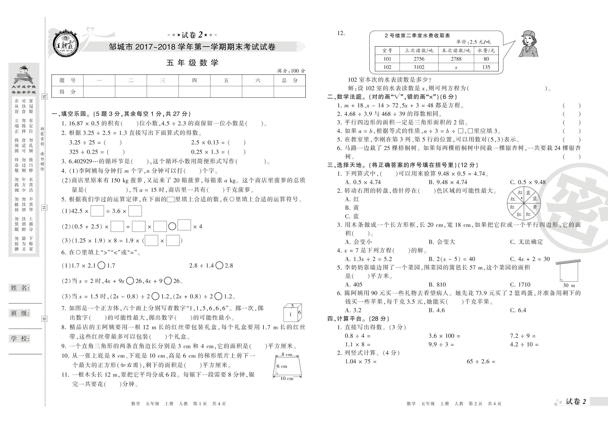 2017-2018学年第一学期邹城市五年级数学试卷(人教版)【2】