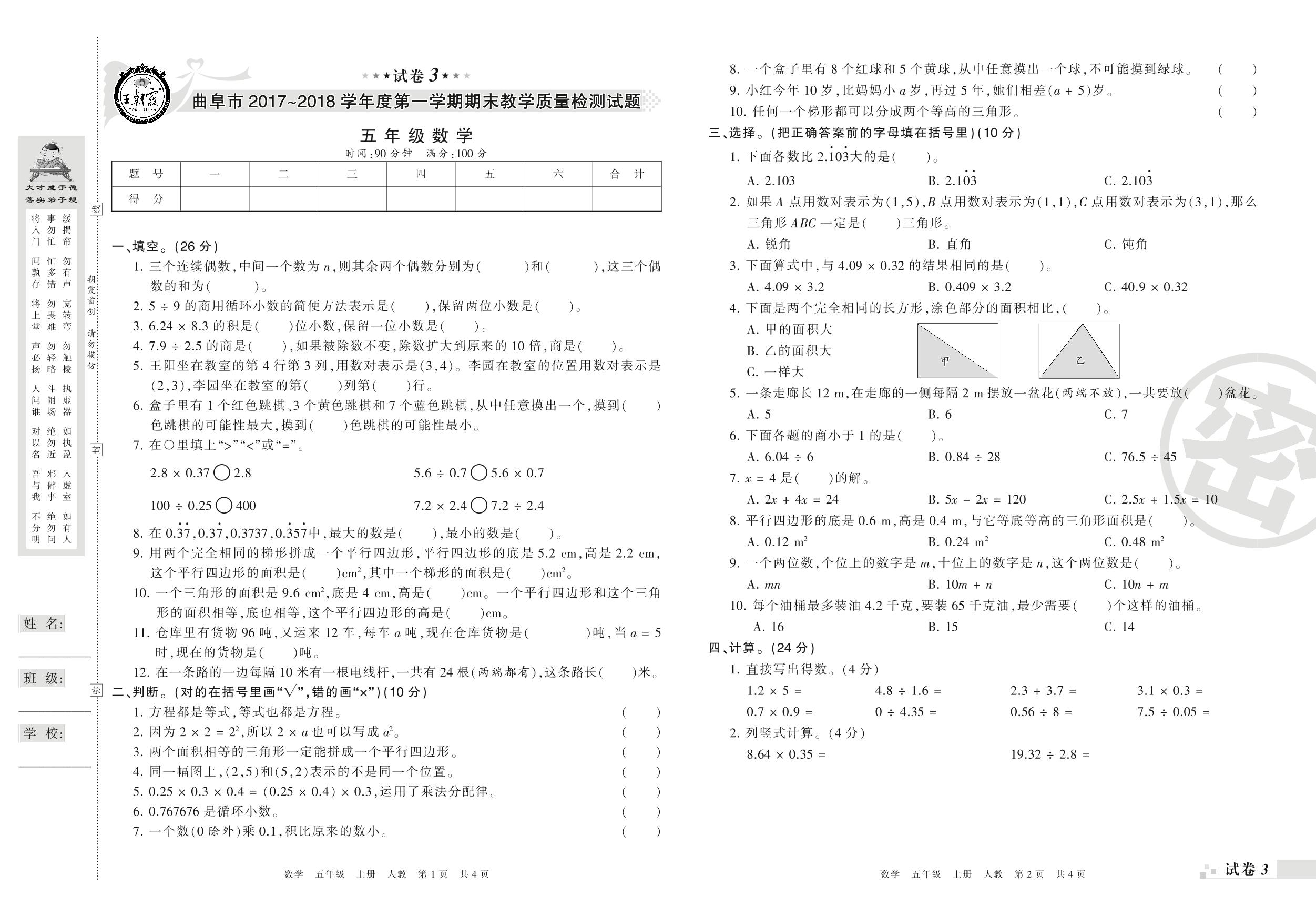 2017-2018学年第一学期曲阜市五年级数学试卷(人教版)【3】