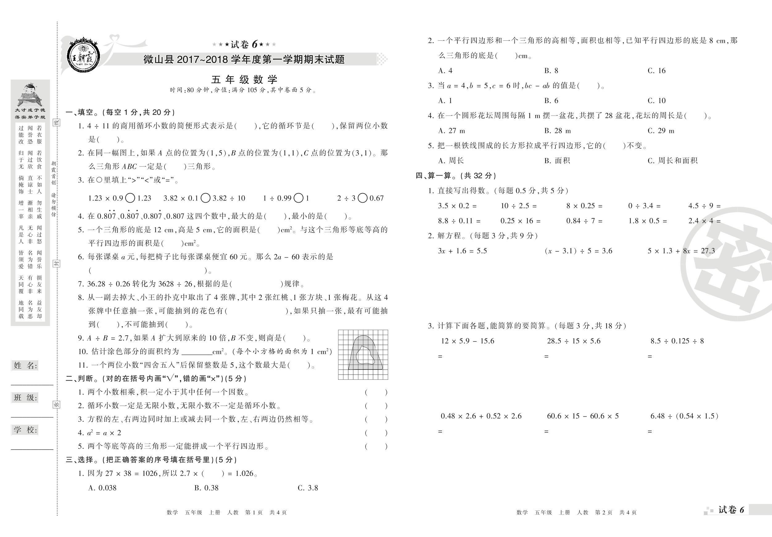 2017-2018学年第一学期济宁市微山县五年级数学试卷(人教版)【6】