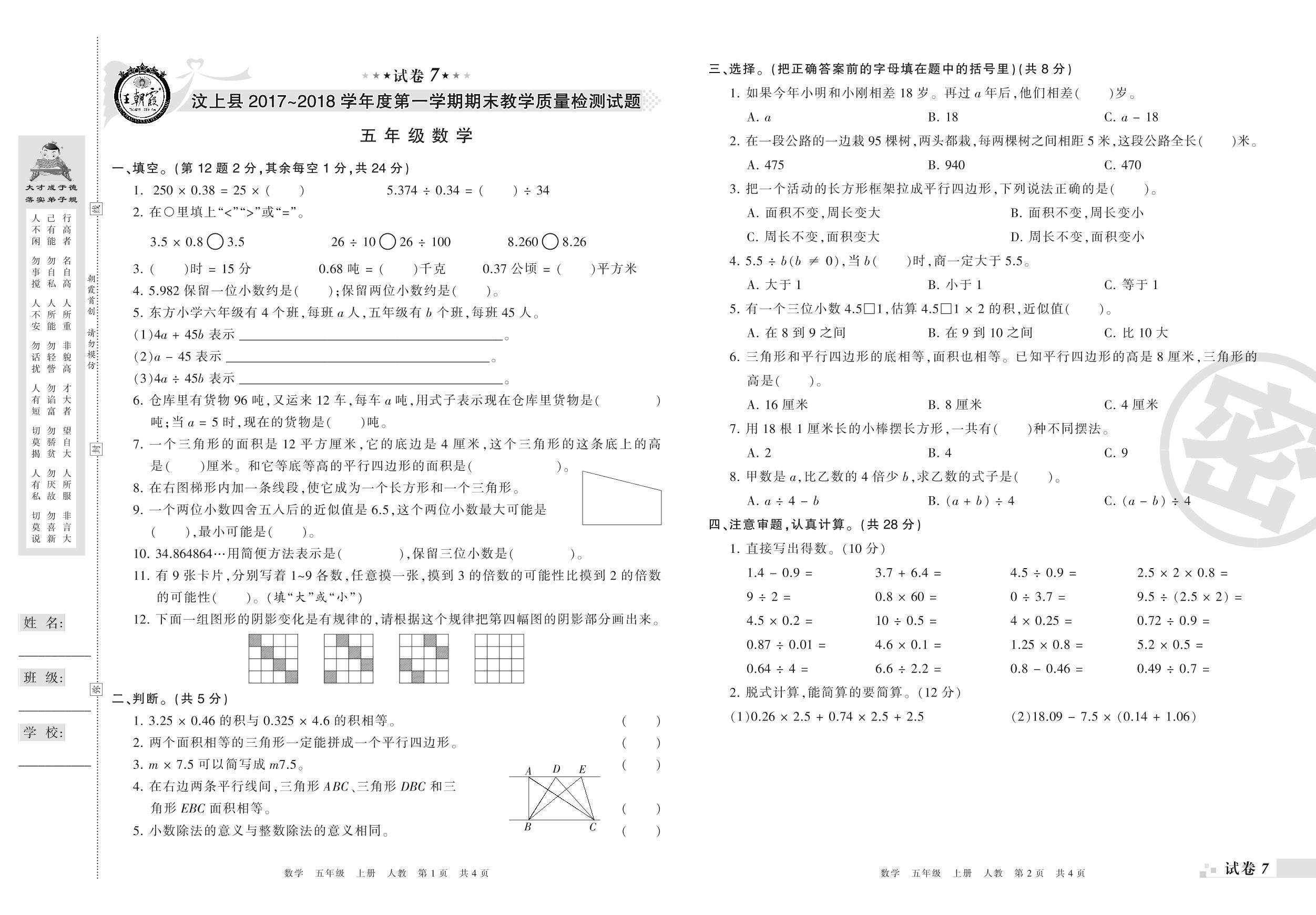 2017-2018学年第一学期济宁市汶上县五年级数学试卷(人教版)【7】