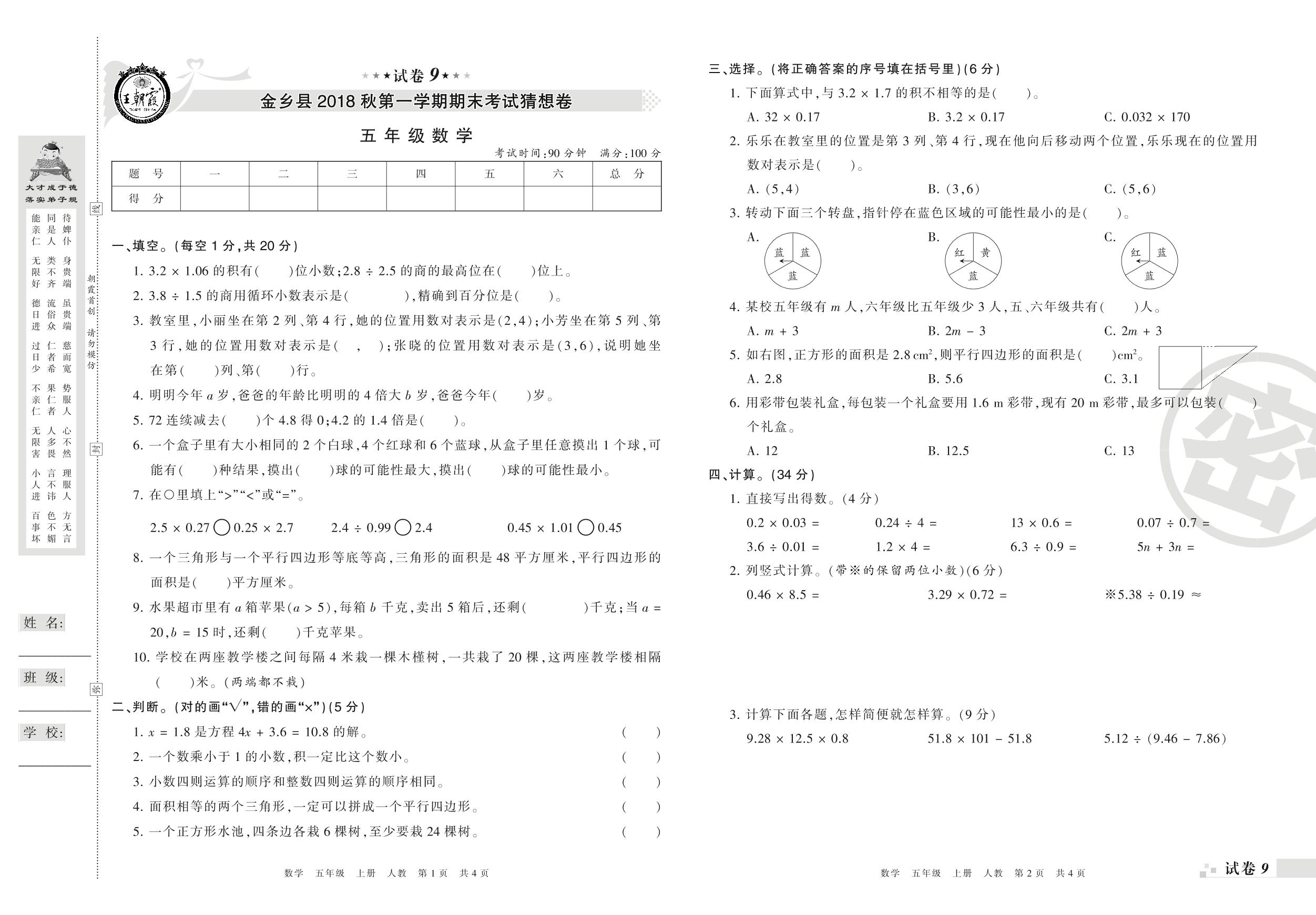 2017-2018学年第一学期济宁市金乡县五年级数学试卷(人教版)【9】
