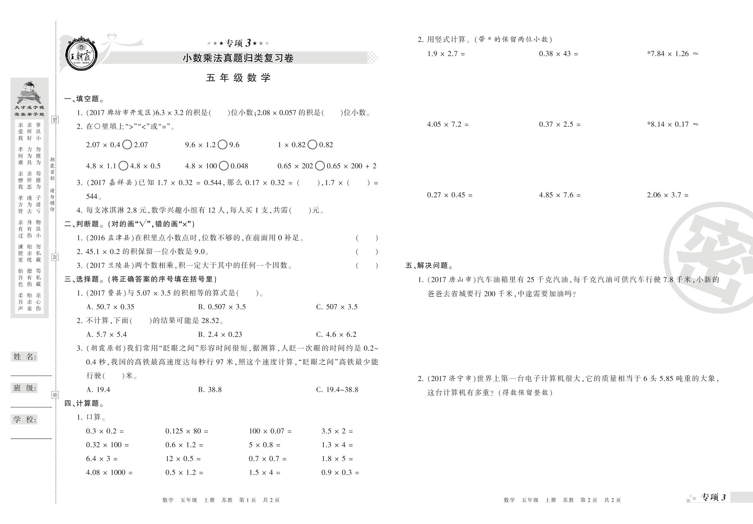 王朝霞期末专项卷——小数乘法、小数除法真题归类复习卷五年级上册数学(苏教版)_R210804184639【0】