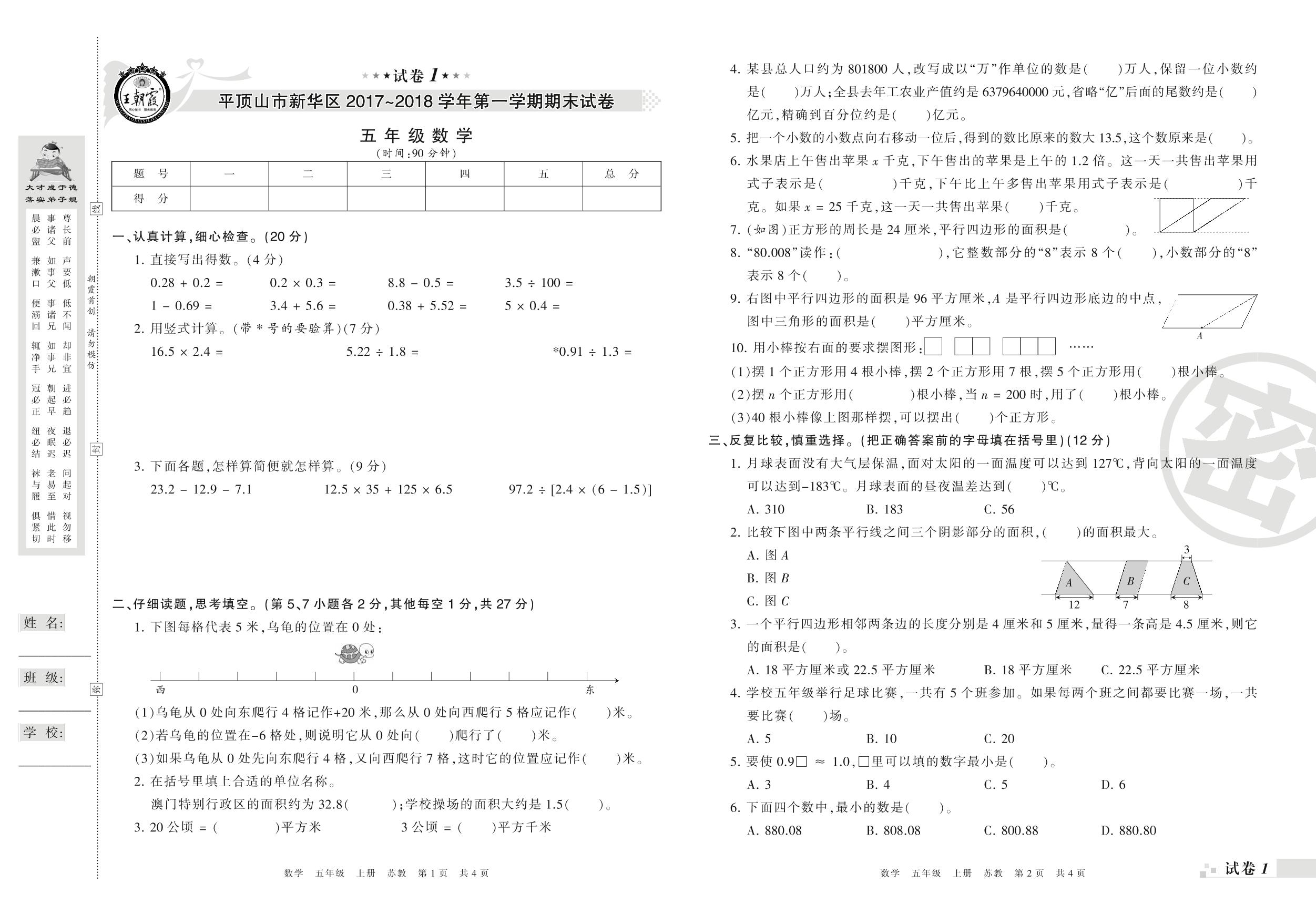 2017-2018学年第一学期平顶山市新华区五年级数学试卷(苏教版)_R210804184644【1】