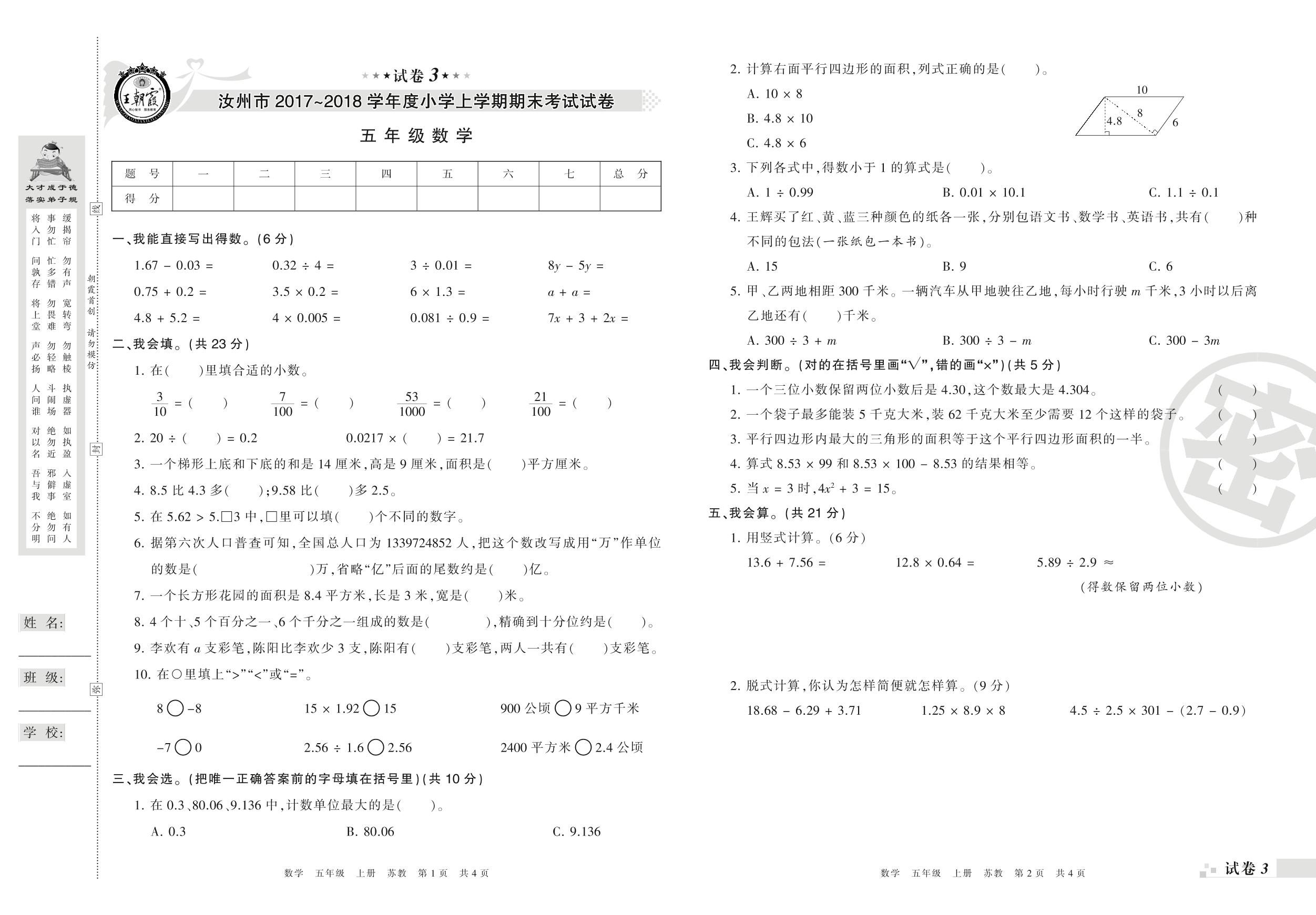 2017-2018学年第一学期汝州市五年级数学试卷(苏教版)【3】