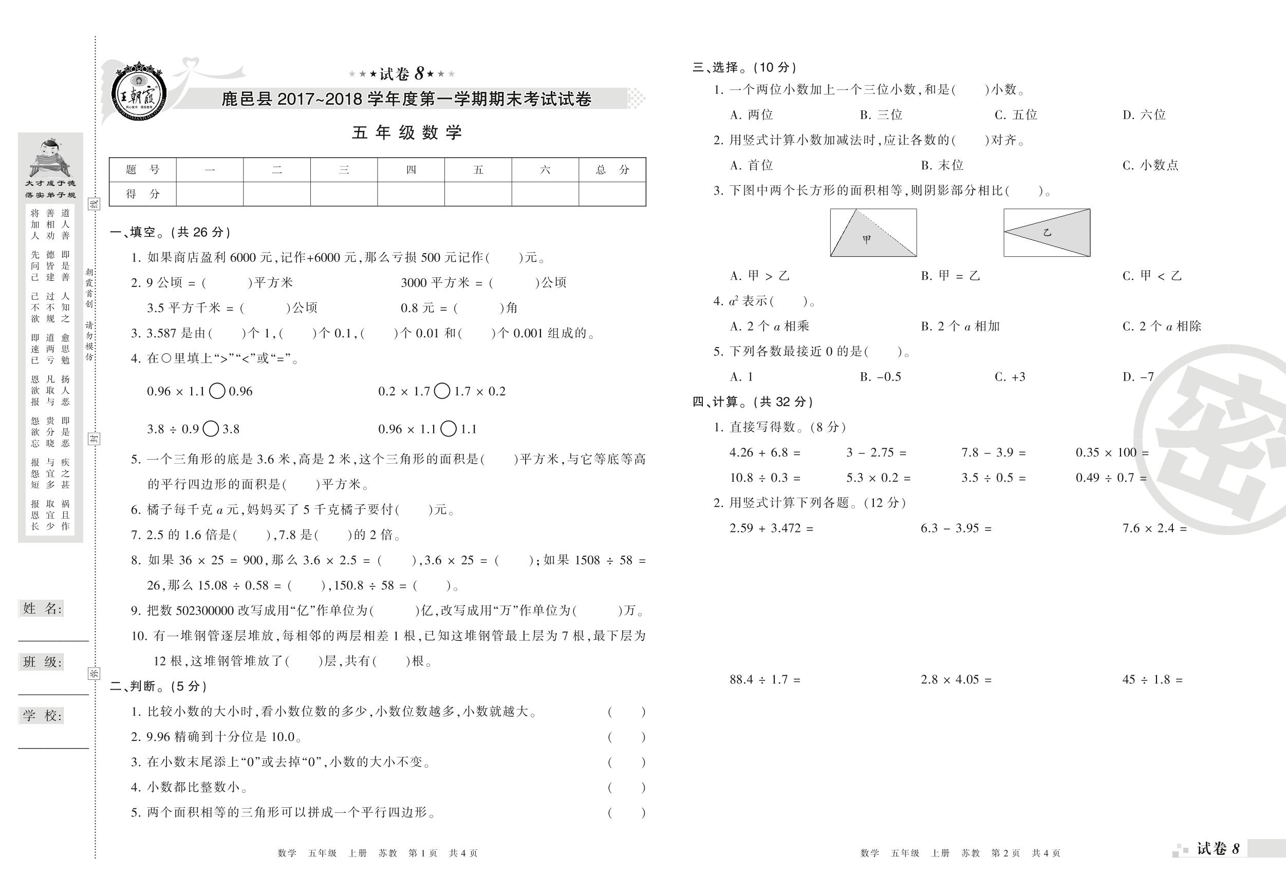 2017-2018学年第一学期周口市鹿邑县五年级数学试卷(苏教版)【8】