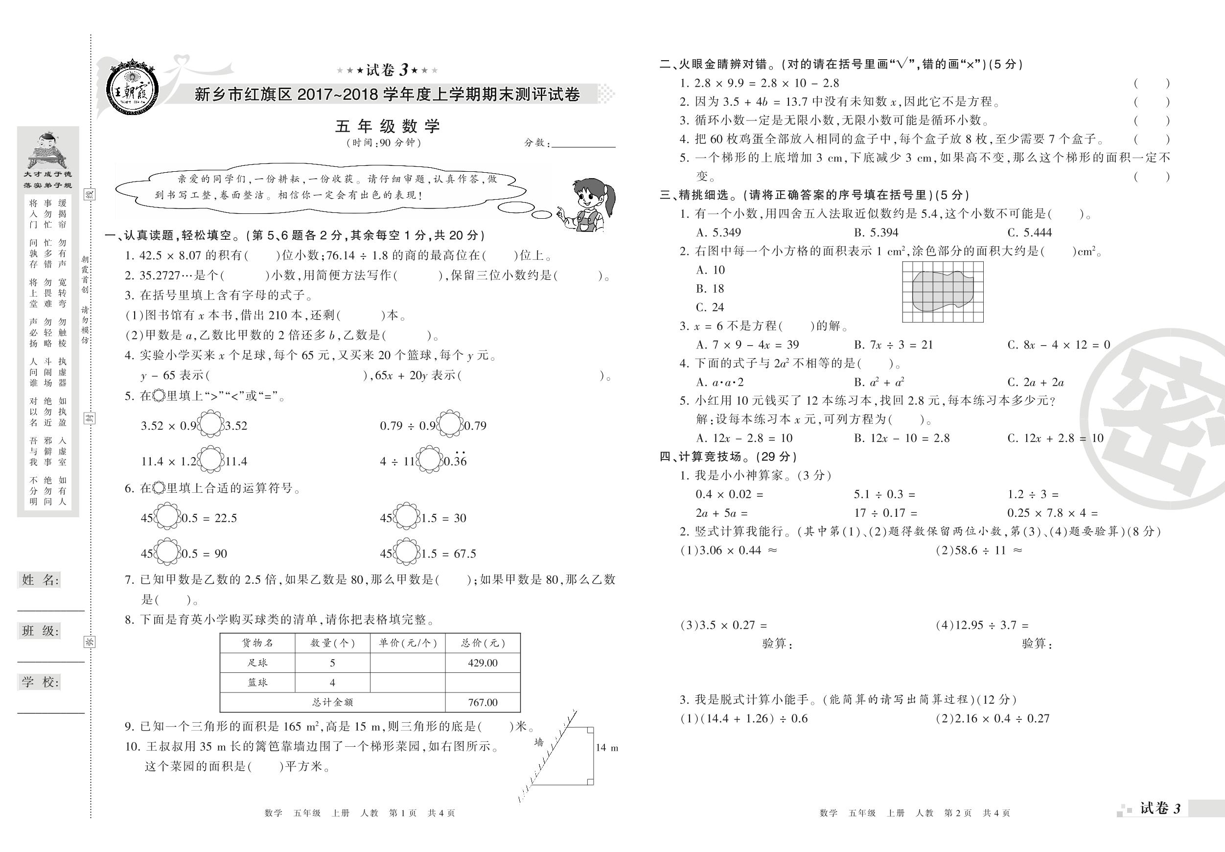 2017-2018学年第一学期新乡市红旗区五年级数学试卷(人教版)【3】