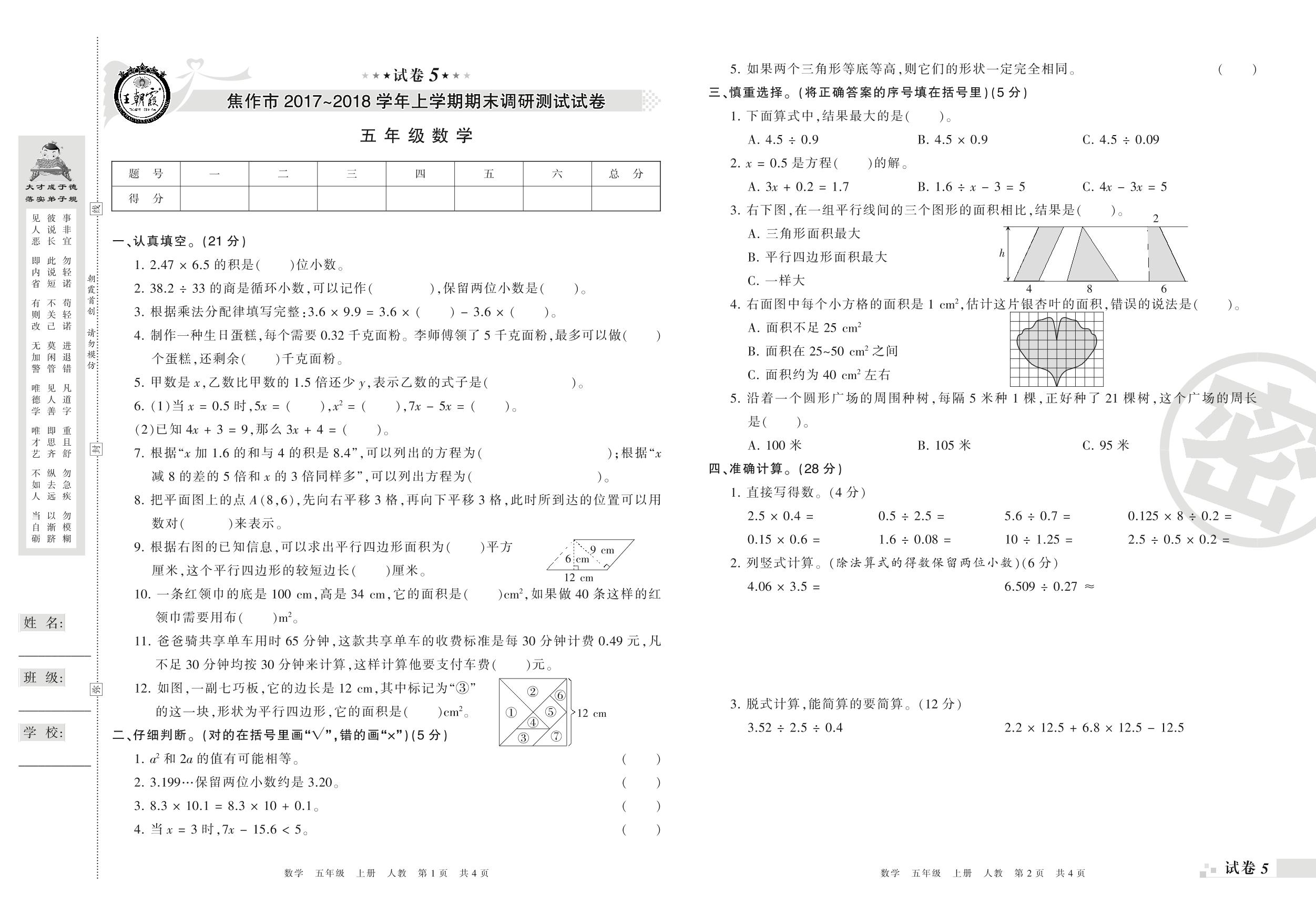 2017-2018学年第一学期焦作市五年级数学试卷(人教版)【5】