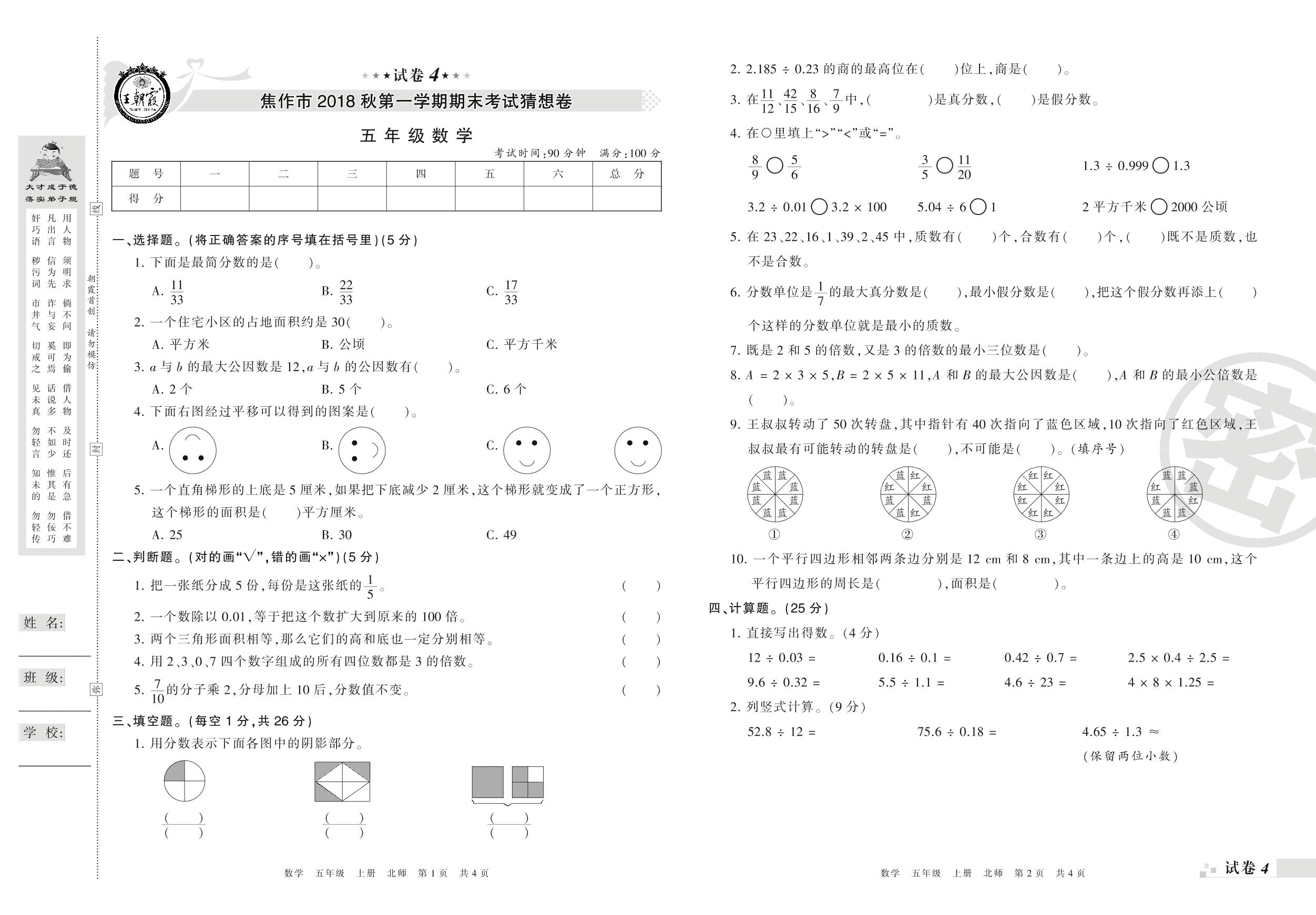 2017-2018学年第一学期焦作市五年级数学试卷(北师版)【4】
