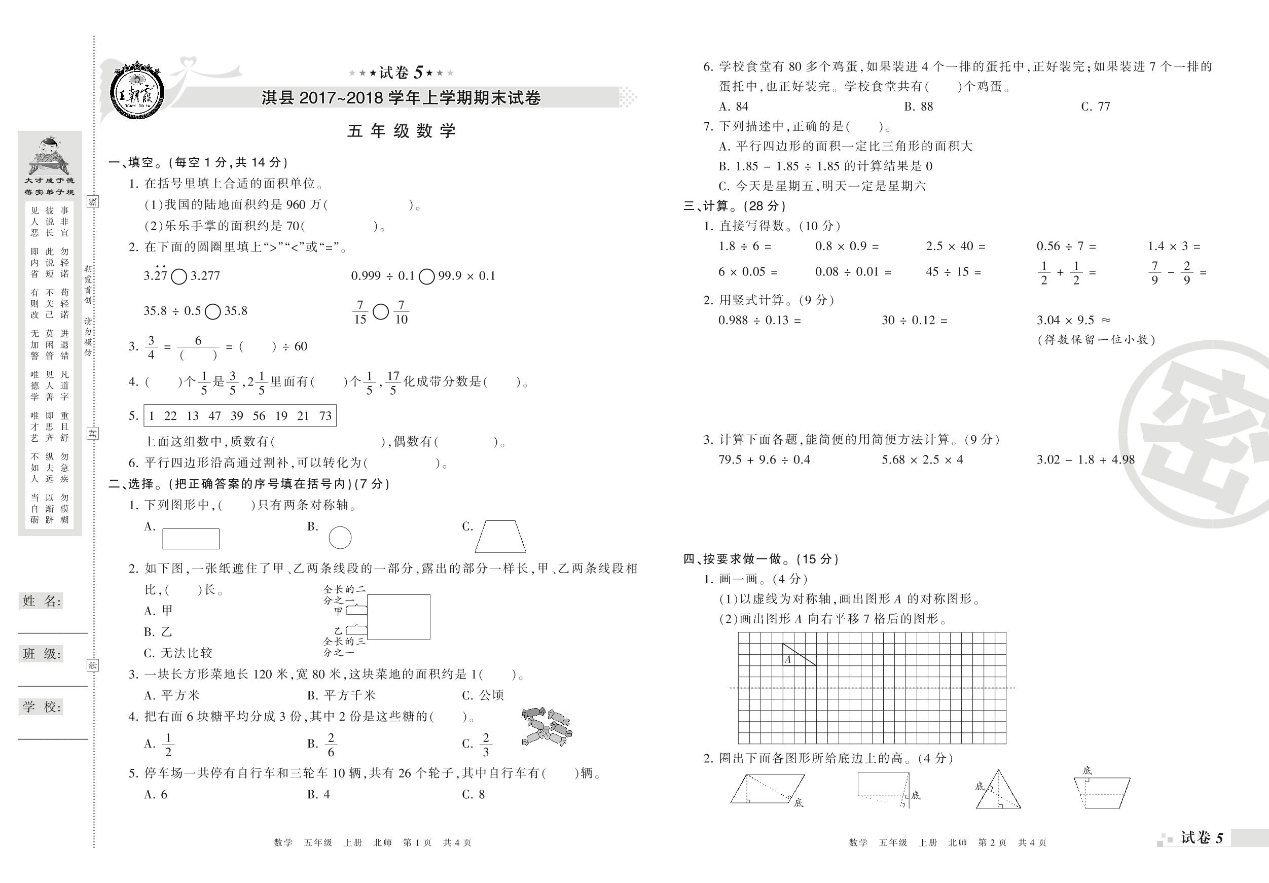 2017-2018学年第一学期鹤壁市淇县五年级数学试卷(北师版)【5】