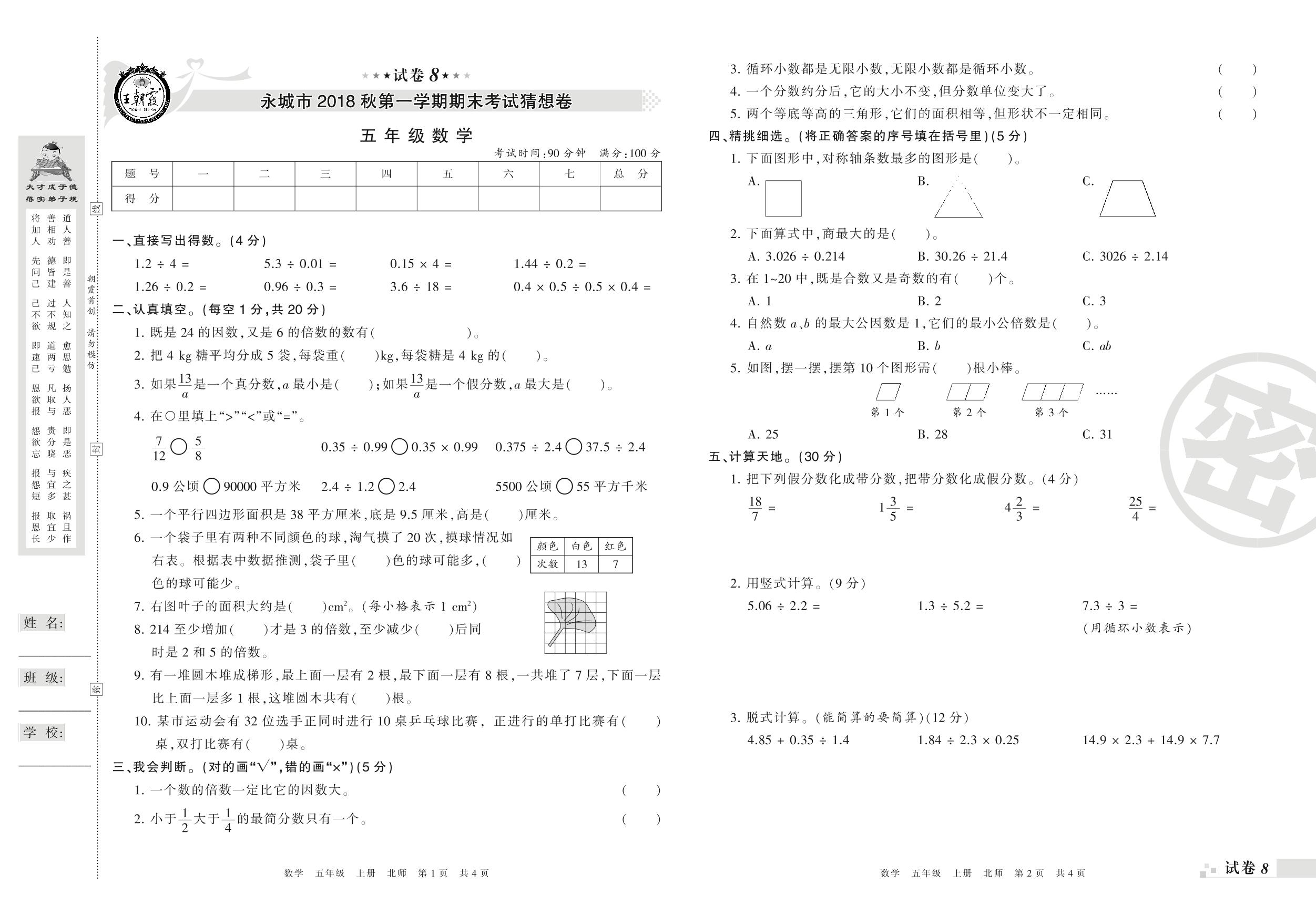 2017-2018学年第一学期商丘市永城县五年级数学试卷(北师版)【8】
