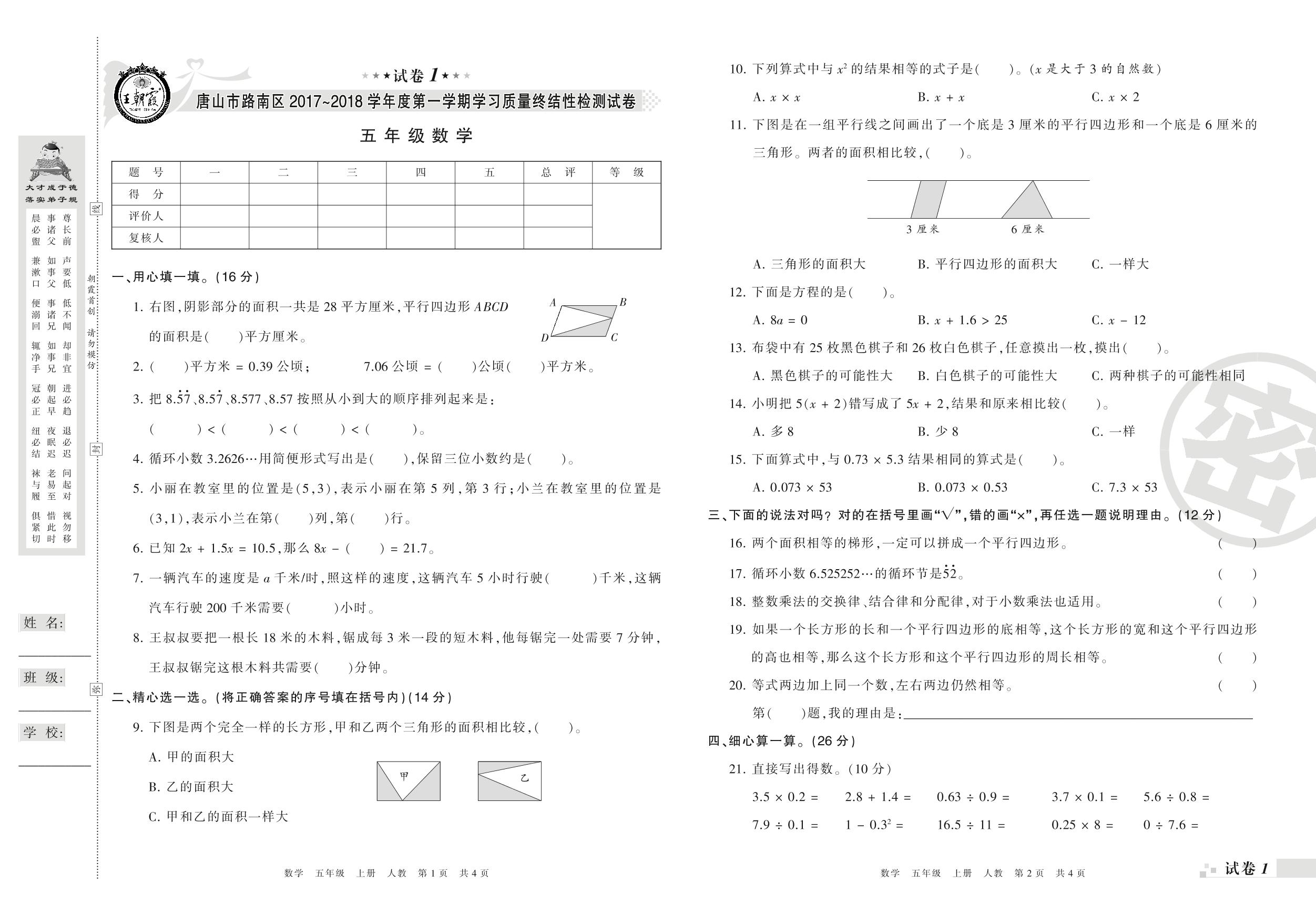 2017-2018学年第一学期唐山市路南区五年级数学试卷(人教版)【1】
