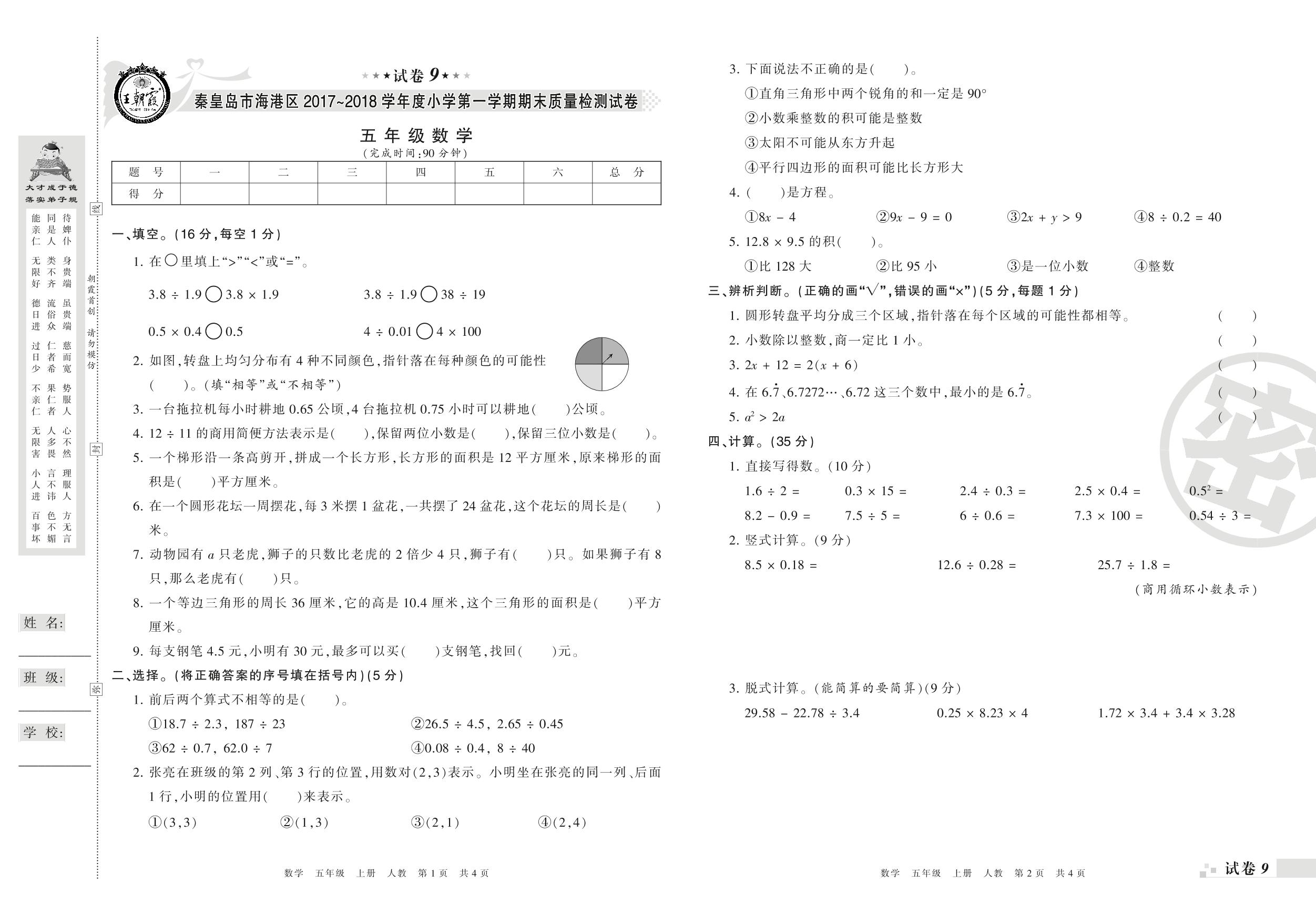 2017-2018学年第一学期秦皇岛市海港区五年级数学试卷(人教版)【9】