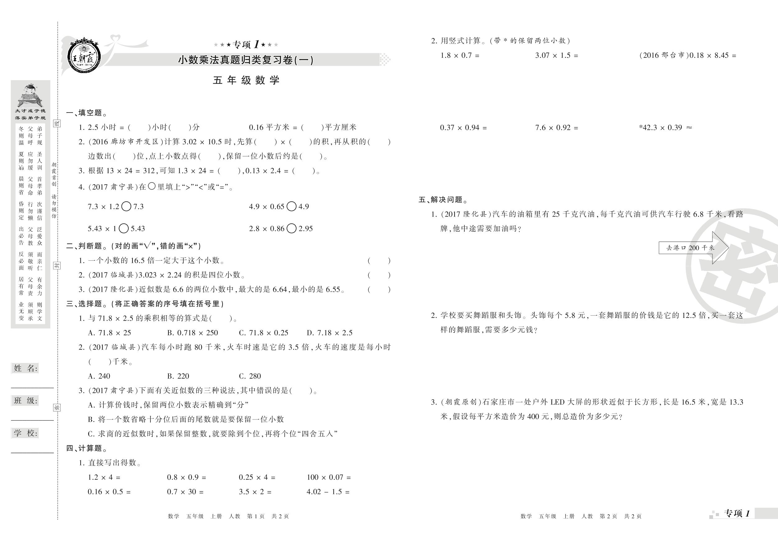 王朝霞期末专项卷——小数乘法(一)(二)真题归类复习卷五年级上册数学(人教版)_R210804184933【0】