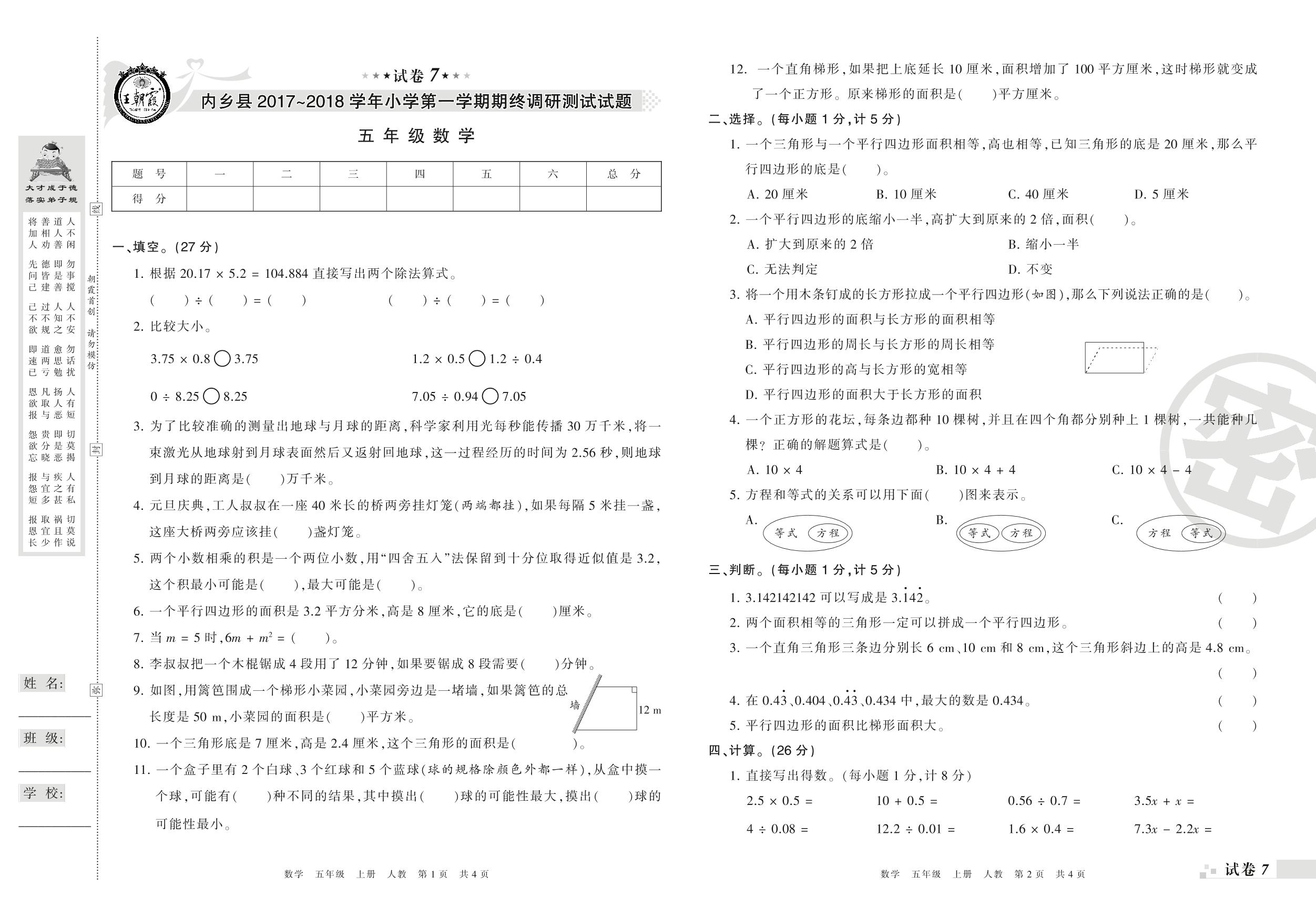 2017-2018学年第一学期南阳市内乡县五年级数学试卷(人教版)【7】