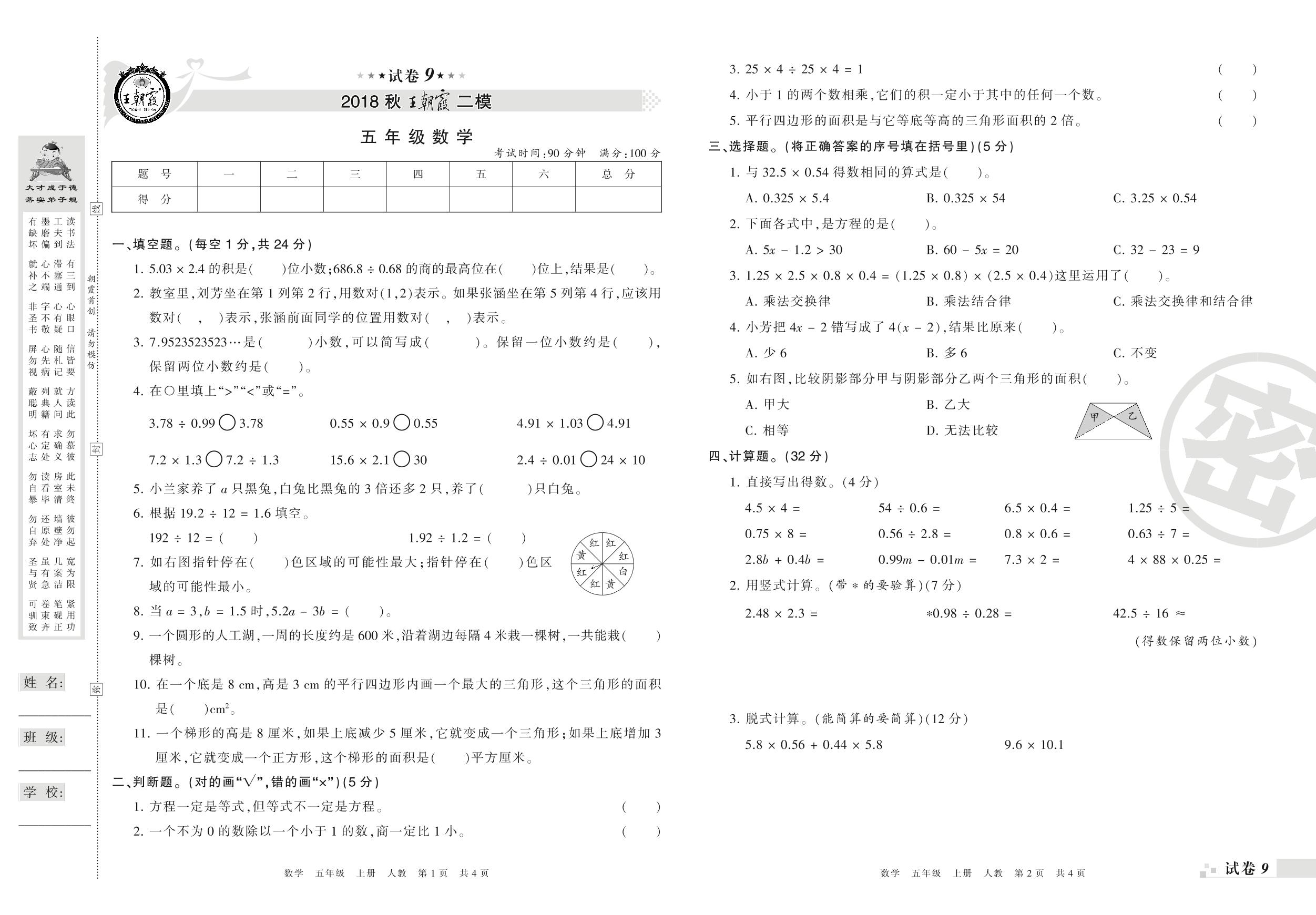 王朝霞期末模拟卷五年级上册数学(人教版)_R210804185041【9】