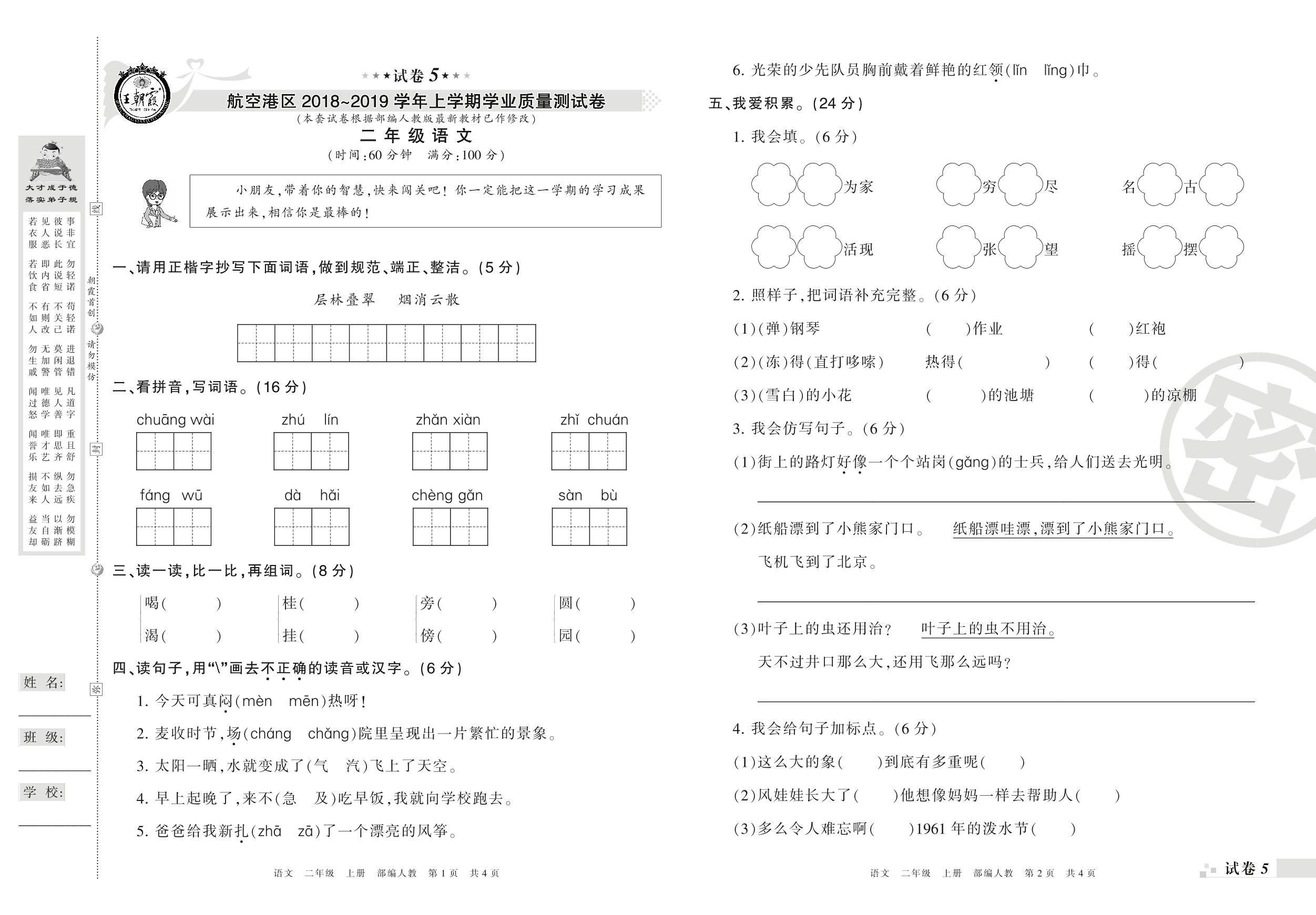 2018-2019学年第一学期郑州市航空港区二年级语文试卷(人教版)【5】