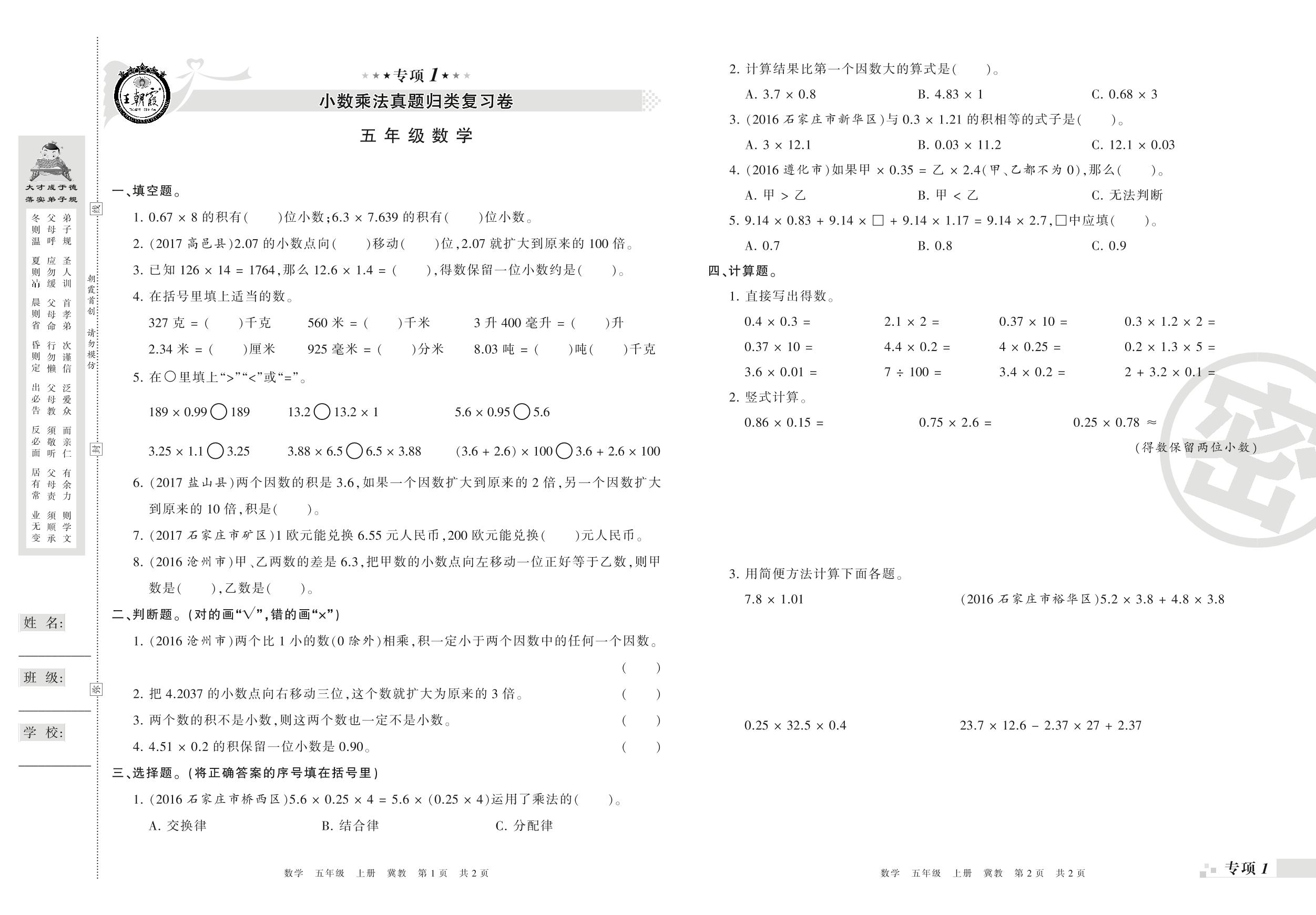 王朝霞期末专项卷——小数乘法、小数除法真题归类复习卷五年级上册数学(冀教版)_R210804185050【0】