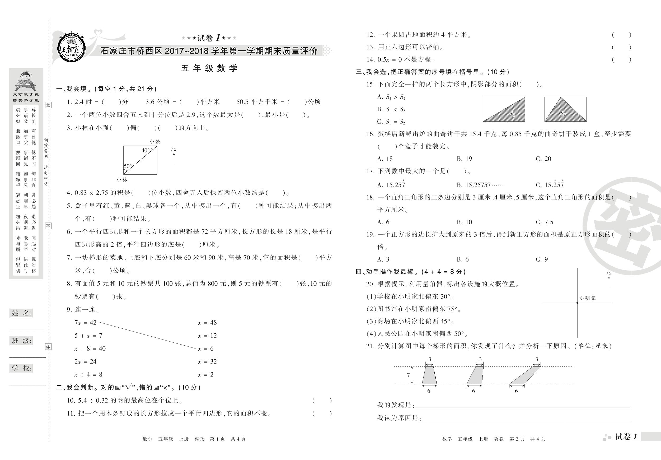 2017-2018学年第一学期石家庄市桥西区五年级数学试卷(冀教版)【1】