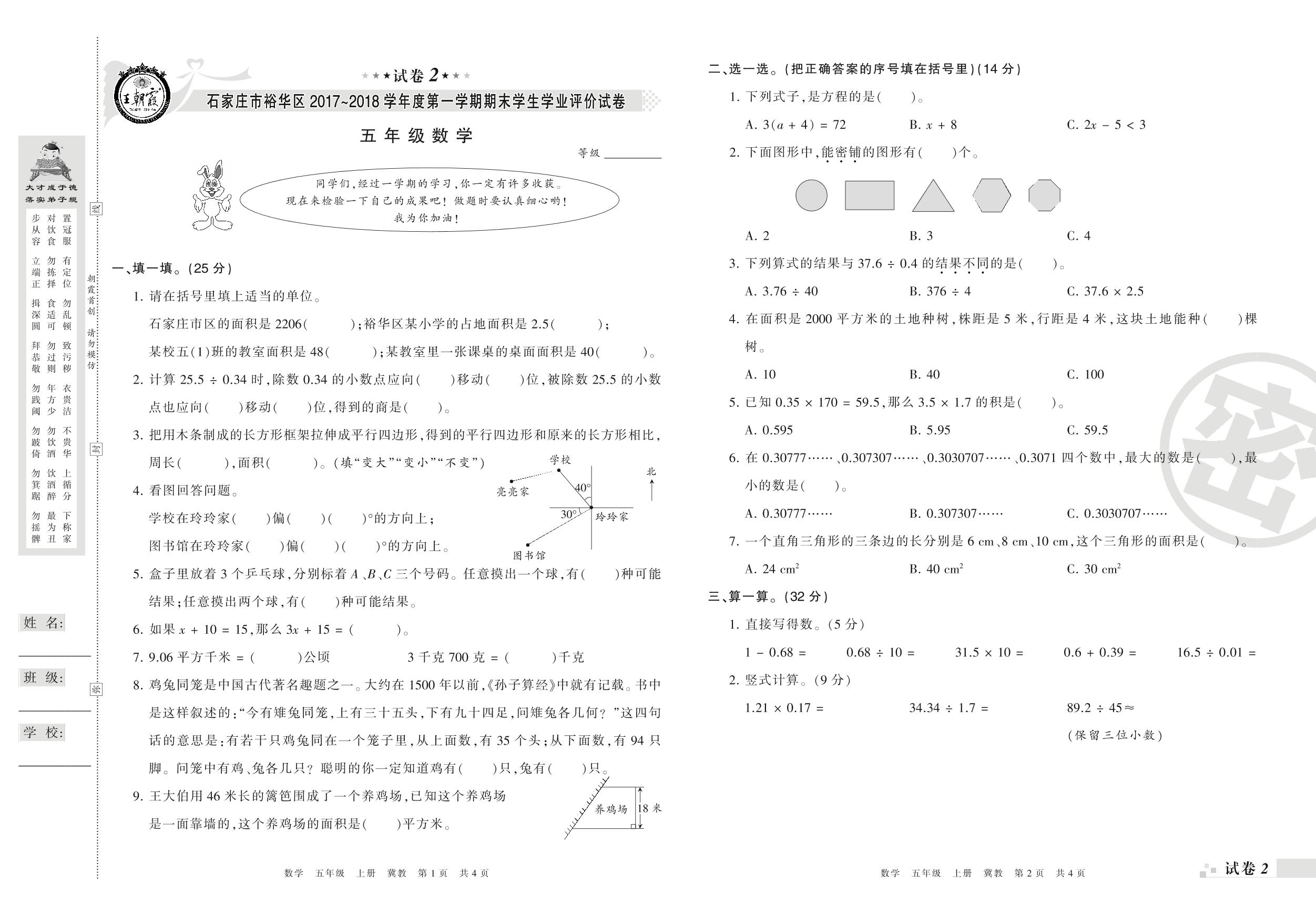 2017-2018学年第一学期石家庄市裕华区五年级数学试卷(冀教版)【2】