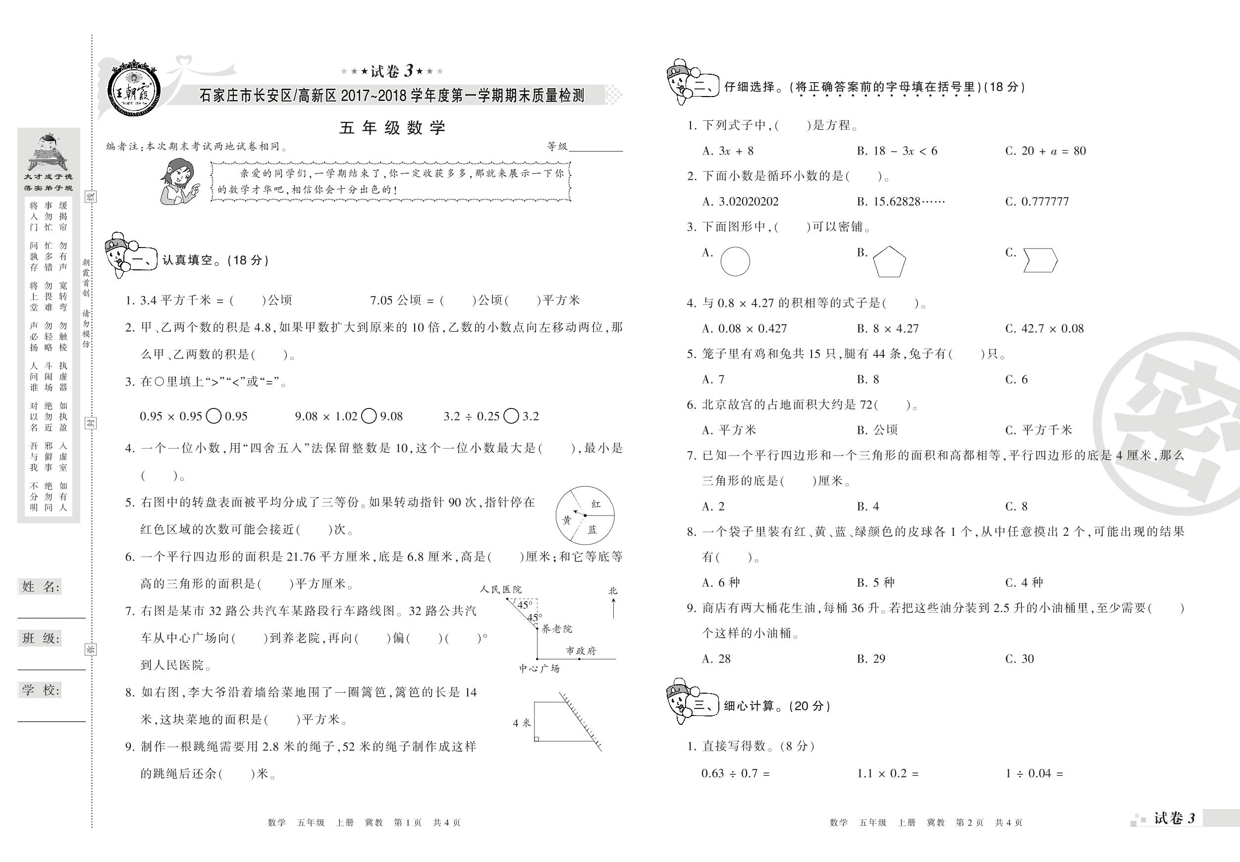 2017-2018学年第一学期石家庄市长安区五年级数学试卷(冀教版)【3】