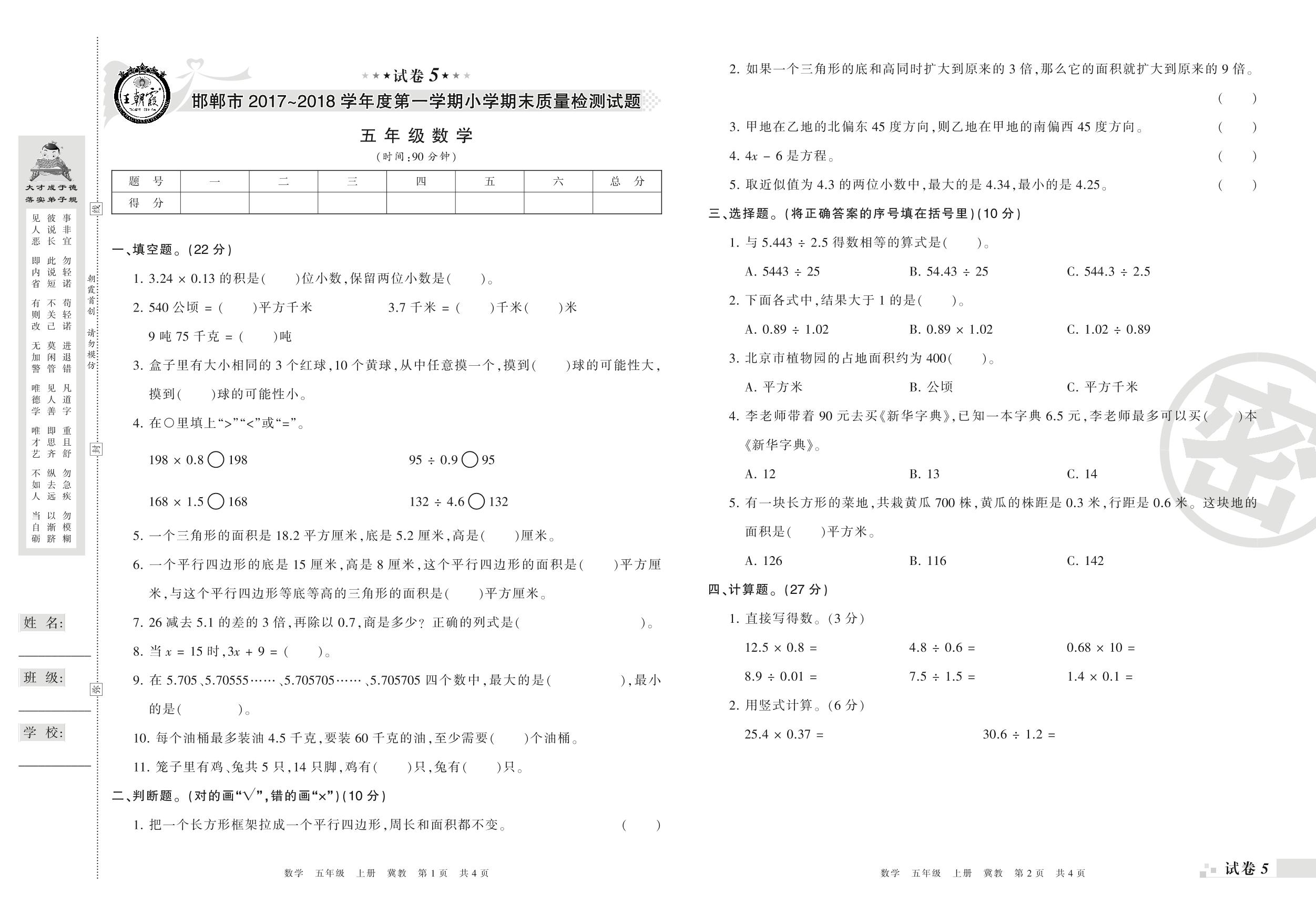 2017-2018学年第一学期邯郸市五年级数学试卷(冀教版)【5】
