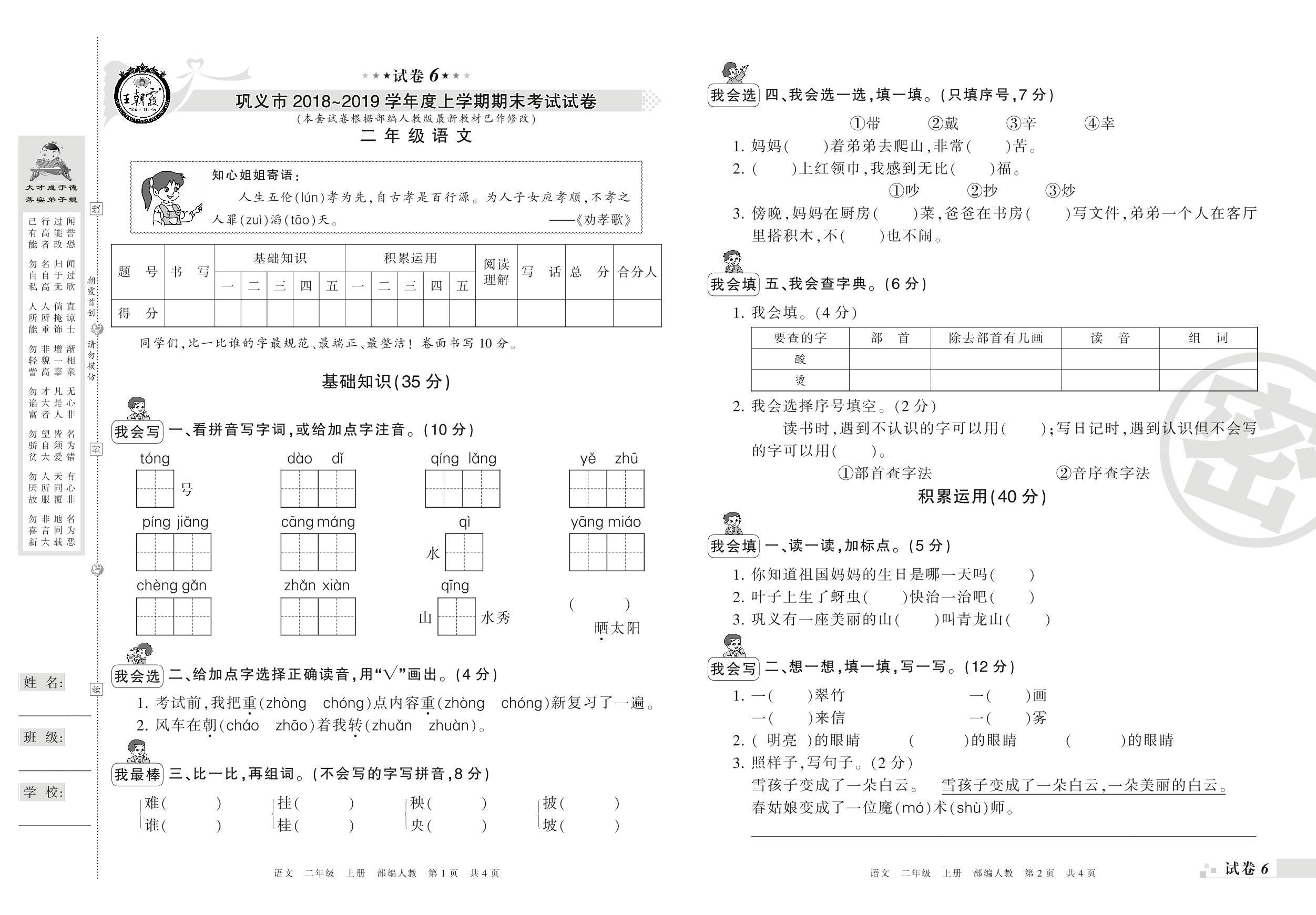 2018-2019学年第一学期巩义市二年级语文试卷(人教版)【6】