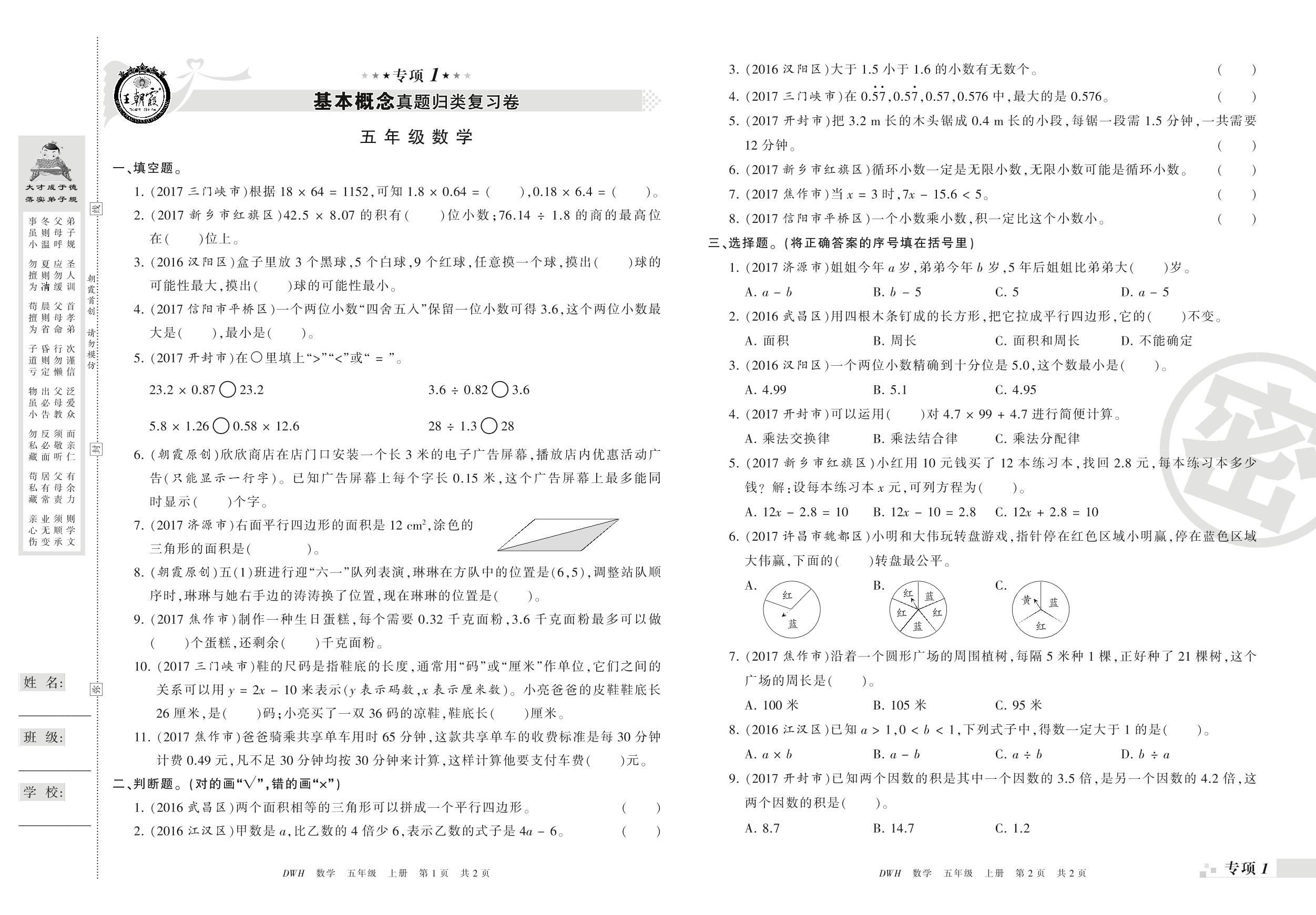 王朝霞期末专项卷——基本概念、计算(一)真题归类复习卷五年级上册数学(人教版)_R210804185222【0】