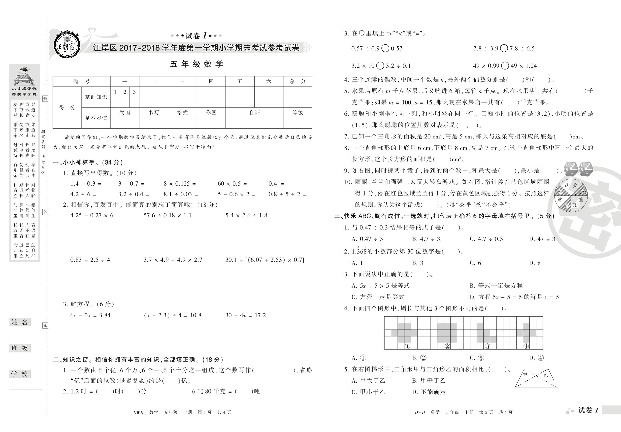 2017-2018学年第一学期武汉市江岸区五年级数学试卷(人教版)【1】