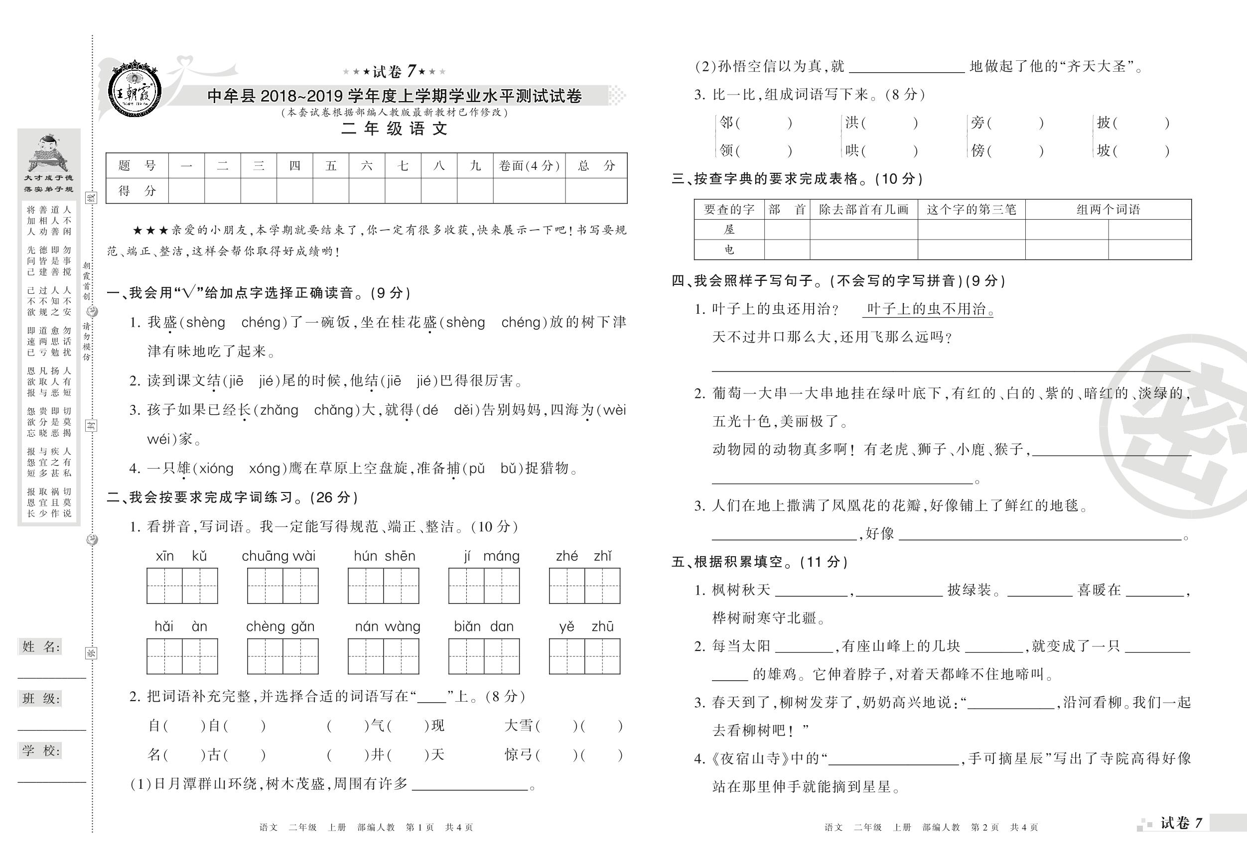 2018-2019学年第一学期郑州市中牟县二年级语文试卷(人教版)【7】