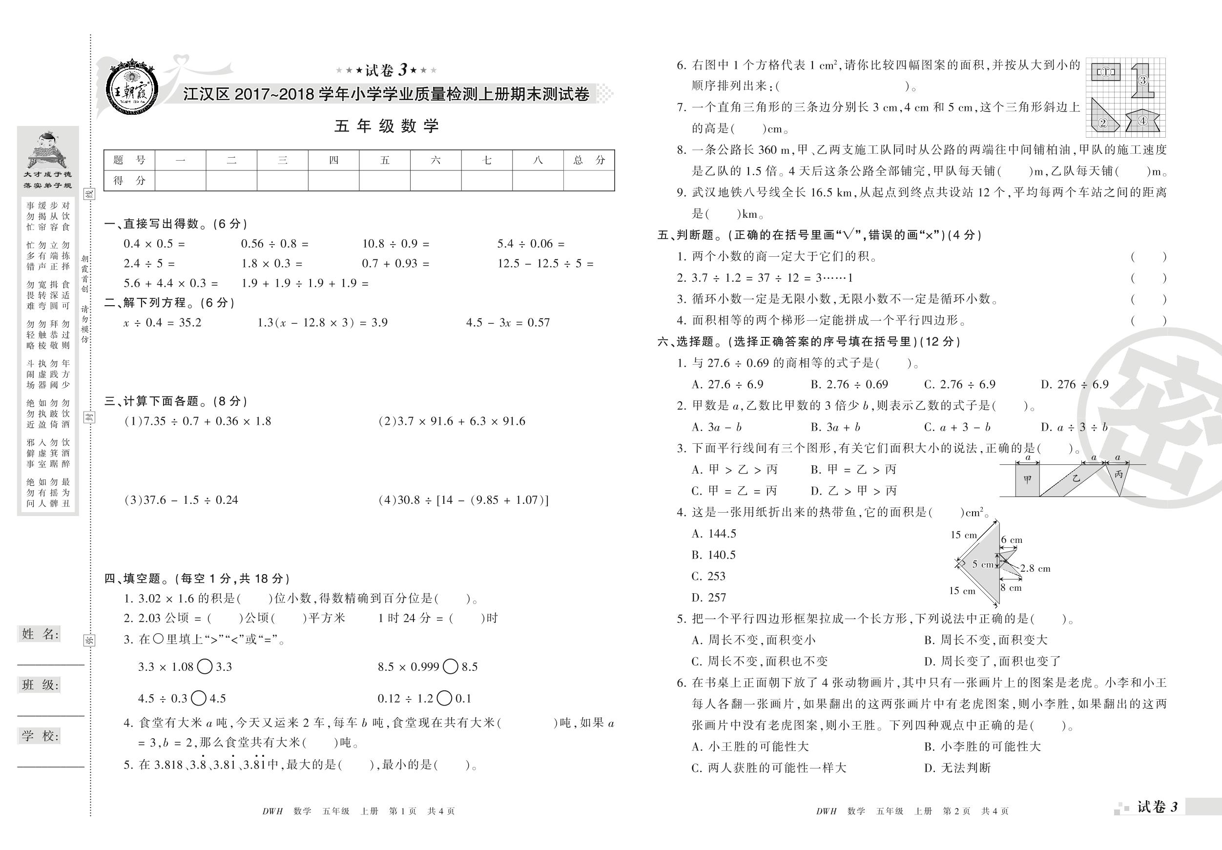 2017-2018学年第一学期武汉市江汉区五年级数学试卷(人教版)【3】