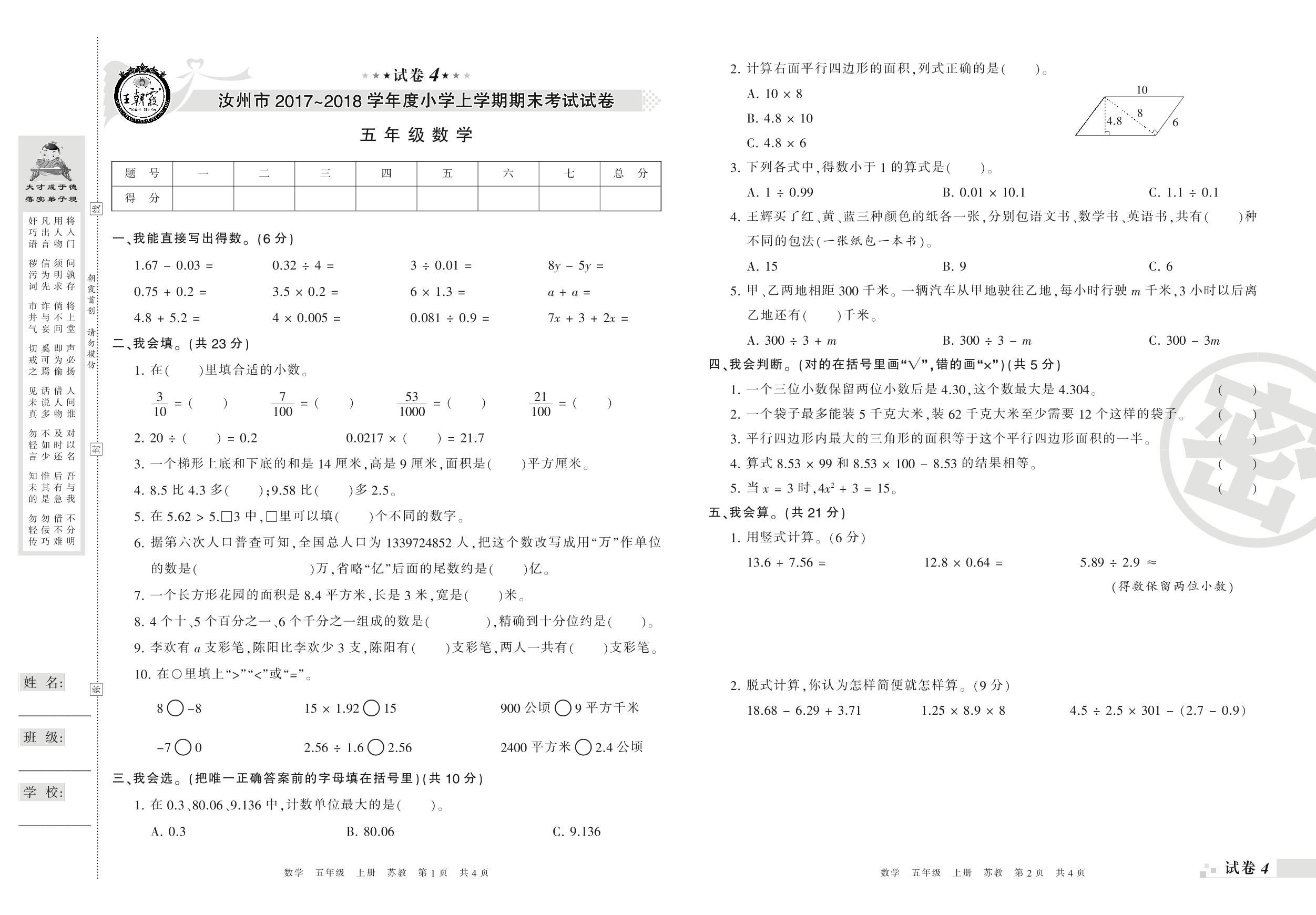 2017-2018学年第一学期汝州市五年级数学试卷(苏教版)【4】