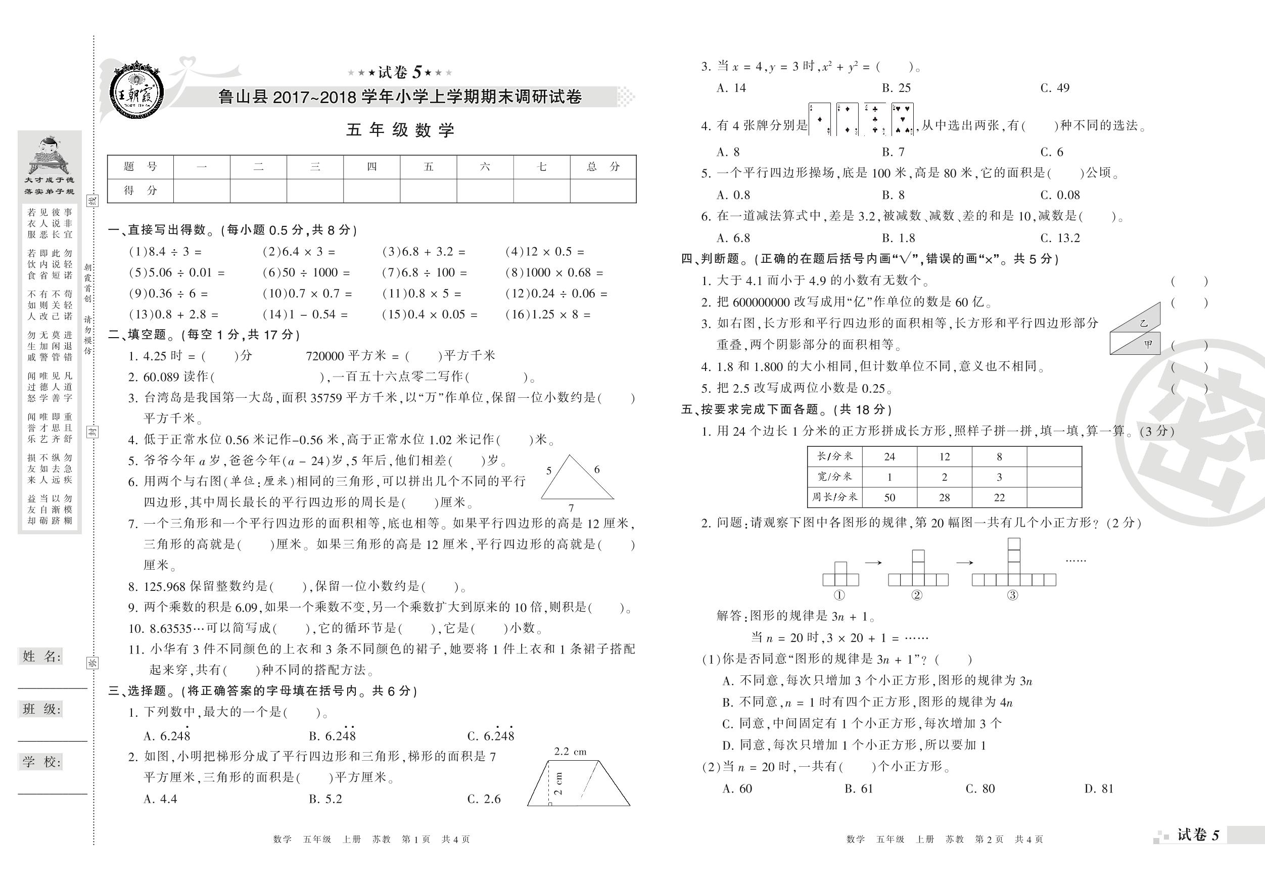 2017-2018学年第一学期平顶山市鲁山县五年级数学试卷(苏教版)【5】