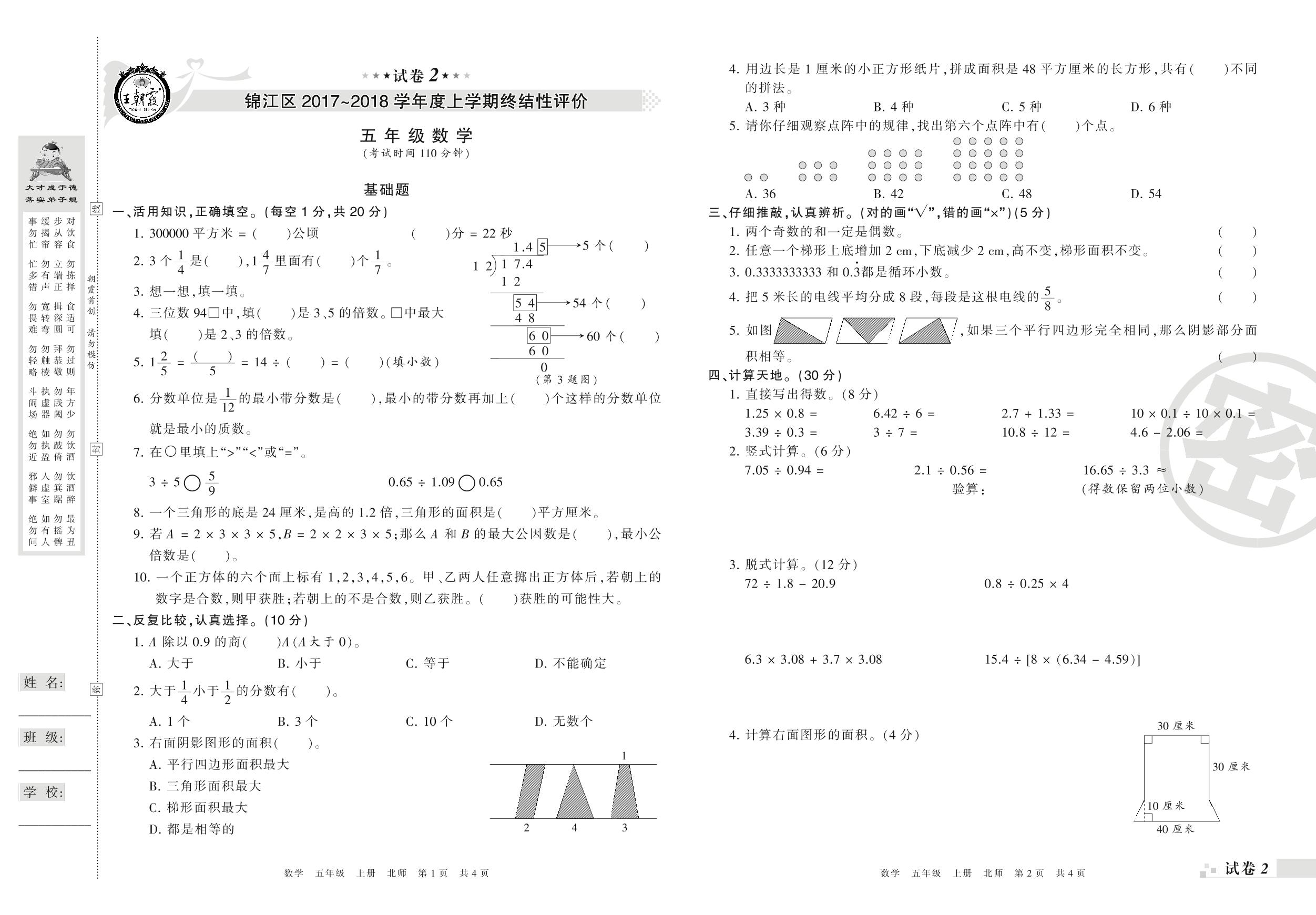 2017-2018学年第一学期成都市锦江区五年级数学试卷(北师版)【2】