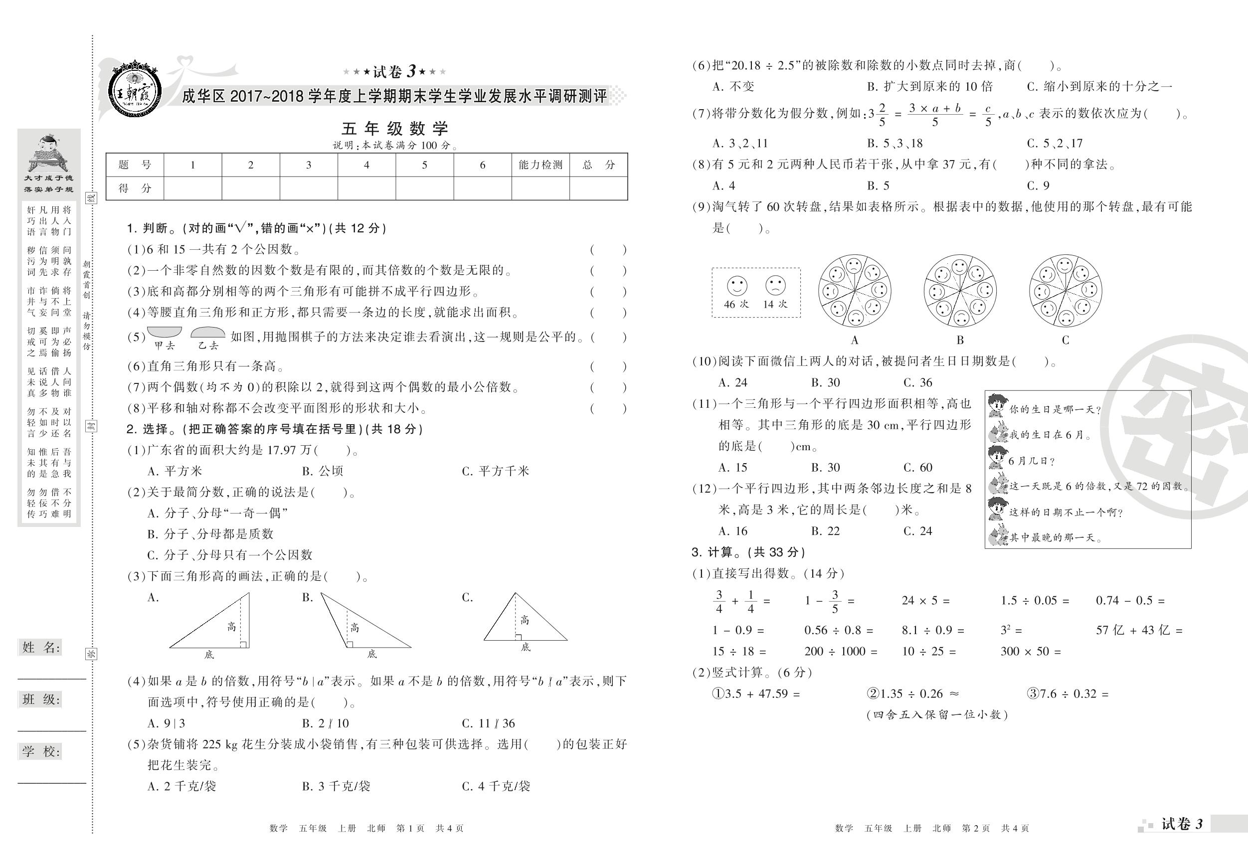 2017-2018学年第一学期成都市成华区五年级数学试卷(北师版)【3】
