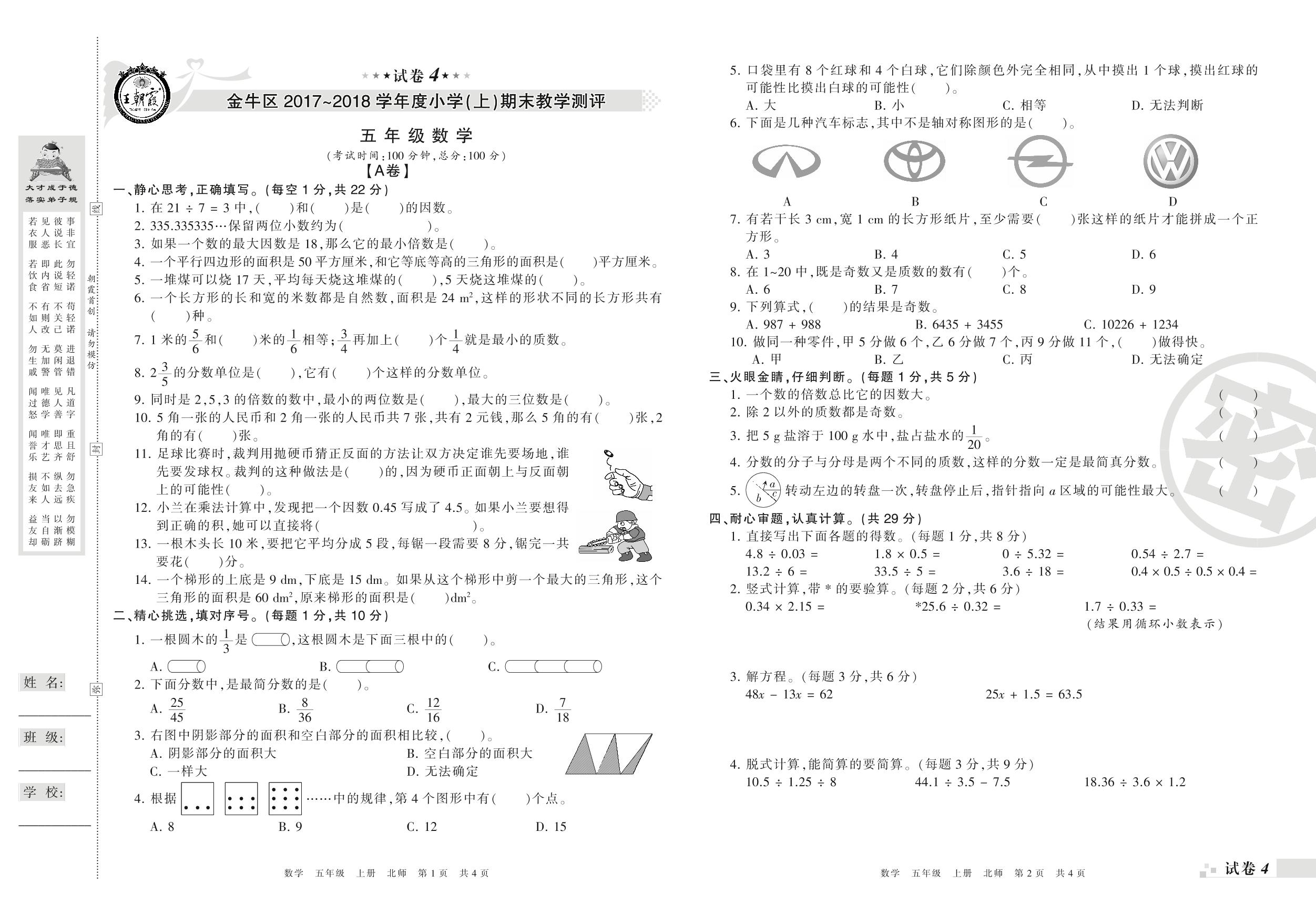 2017-2018学年第一学期成都市金牛区五年级数学试卷(北师版)【4】