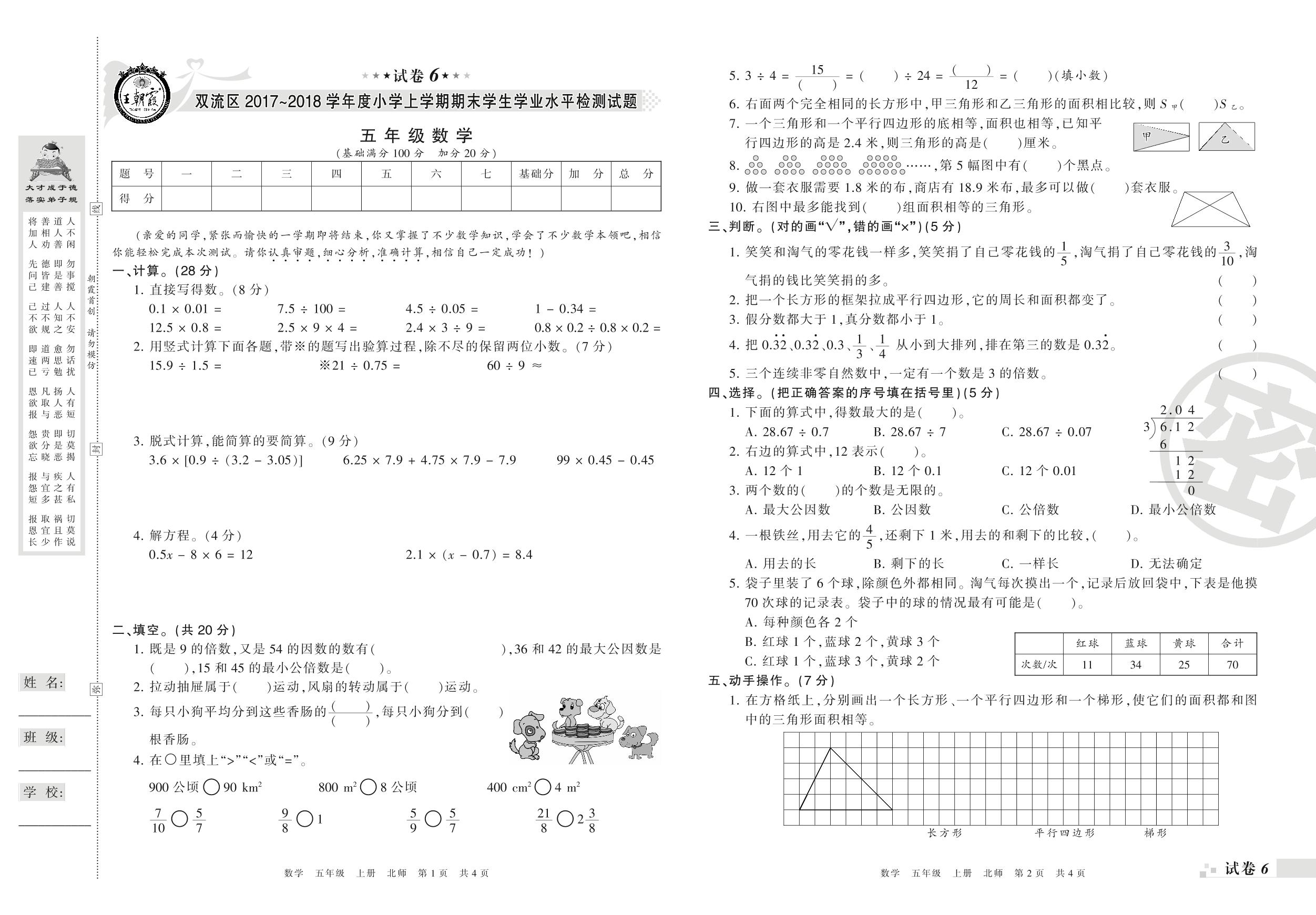 2017-2018学年第一学期成都市双流区五年级数学试卷(北师版)【6】