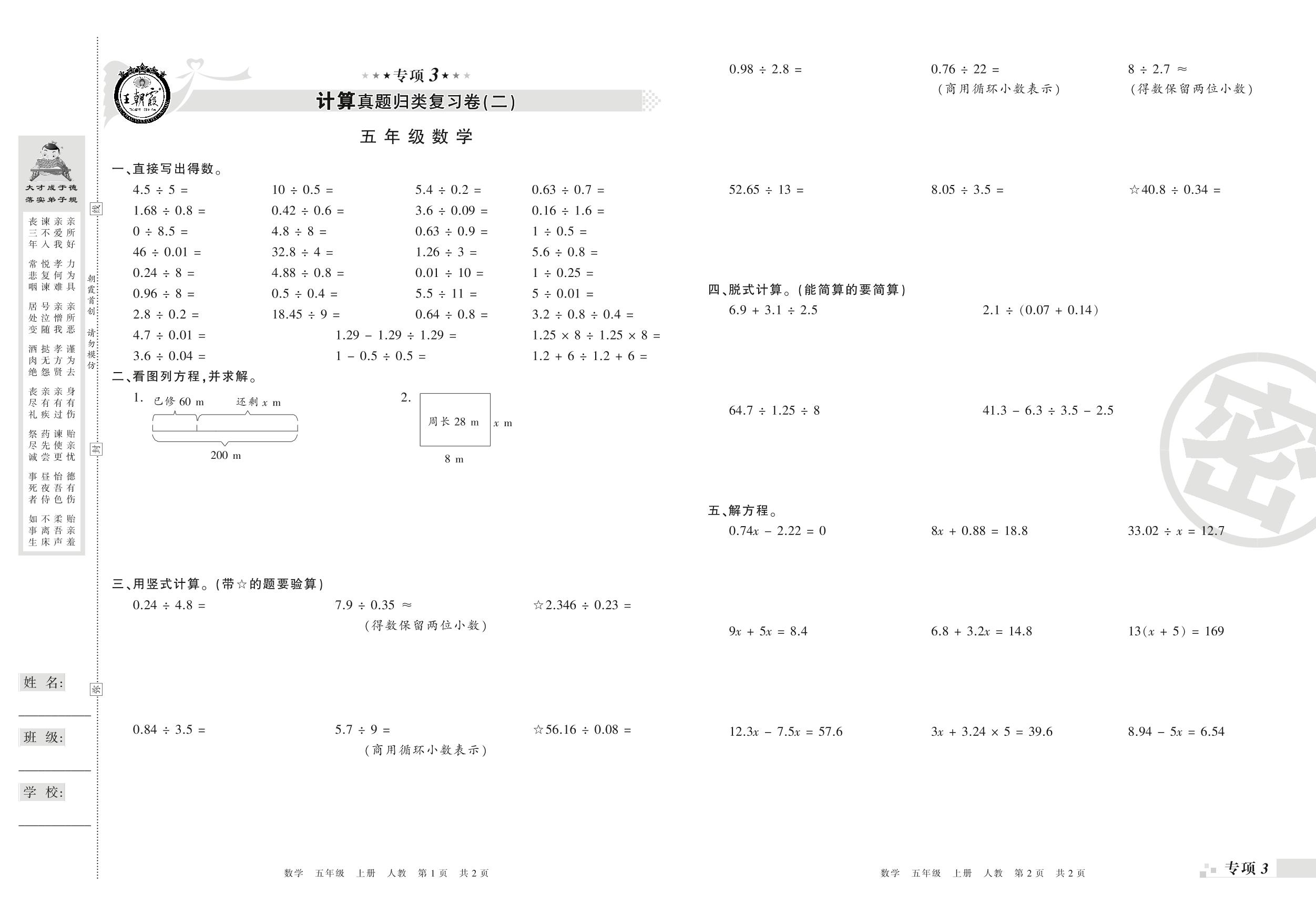 王朝霞期末专项卷——计算(二)、解决问题真题归类复习卷五年级上册数学(人教版)_R210804185517【0】