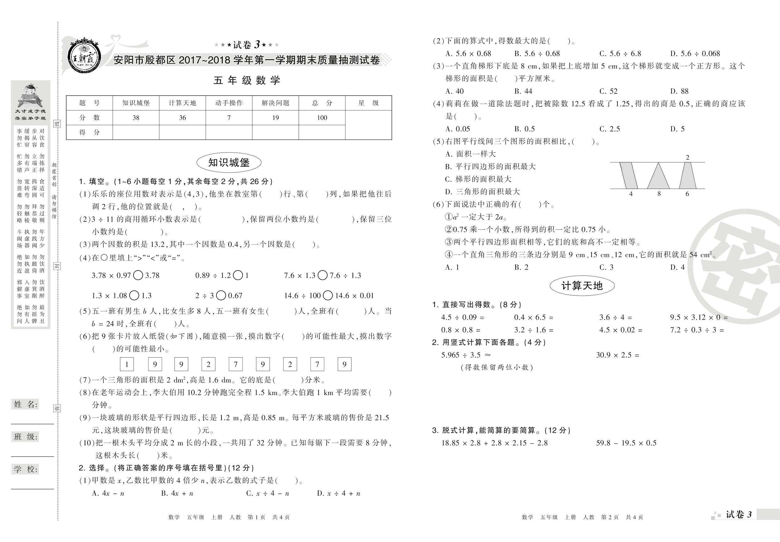 2017-2018学年第一学期安阳市殷都区五年级数学试卷(人教版)【3】