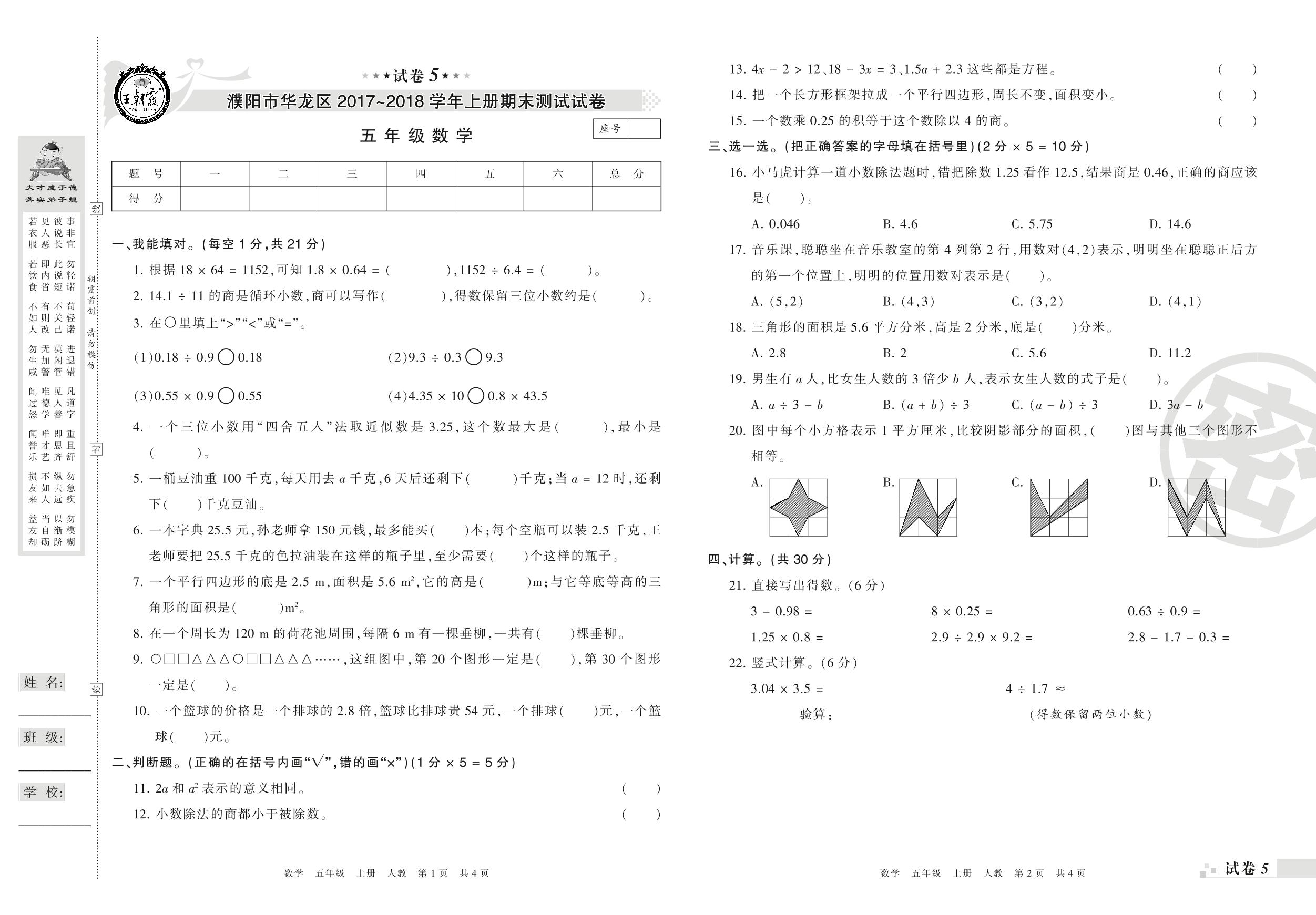 2017-2018学年第一学期濮阳市华龙区五年级数学试卷(人教版)【5】