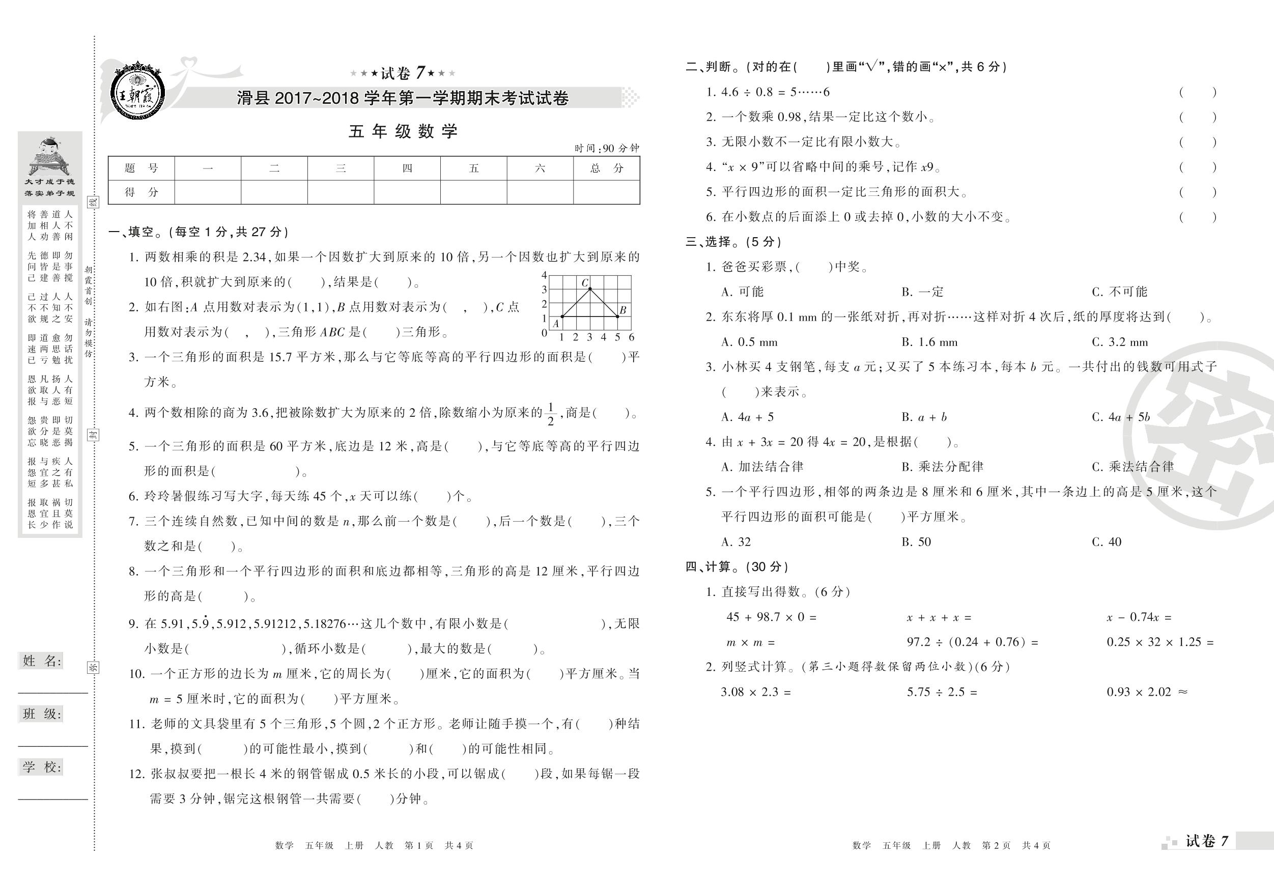 2017-2018学年第一学期安阳市滑县五年级数学试卷(人教版)【7】