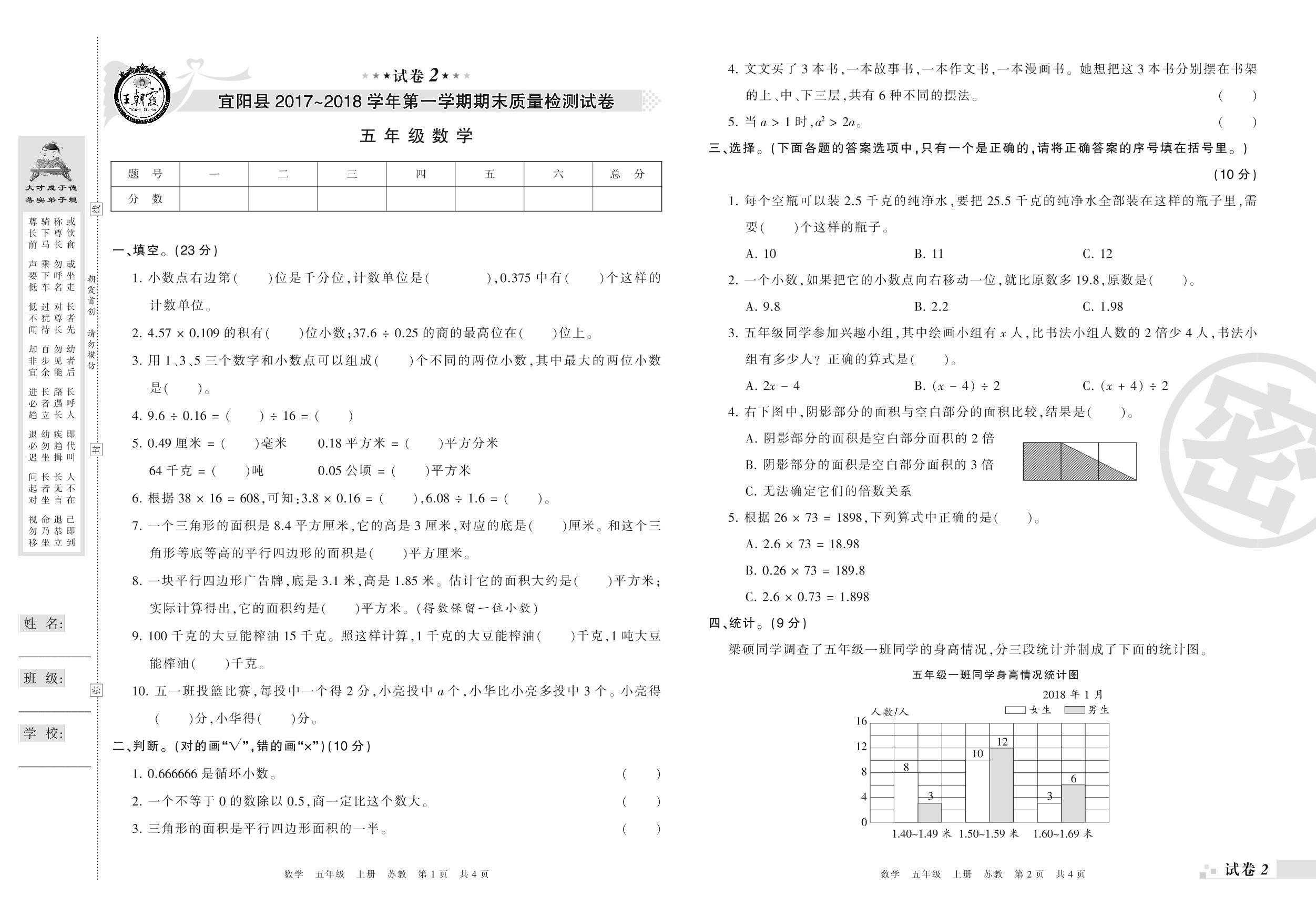 2017-2018学年第一学期洛阳市宜阳县五年级数学试卷(苏教版)【2】