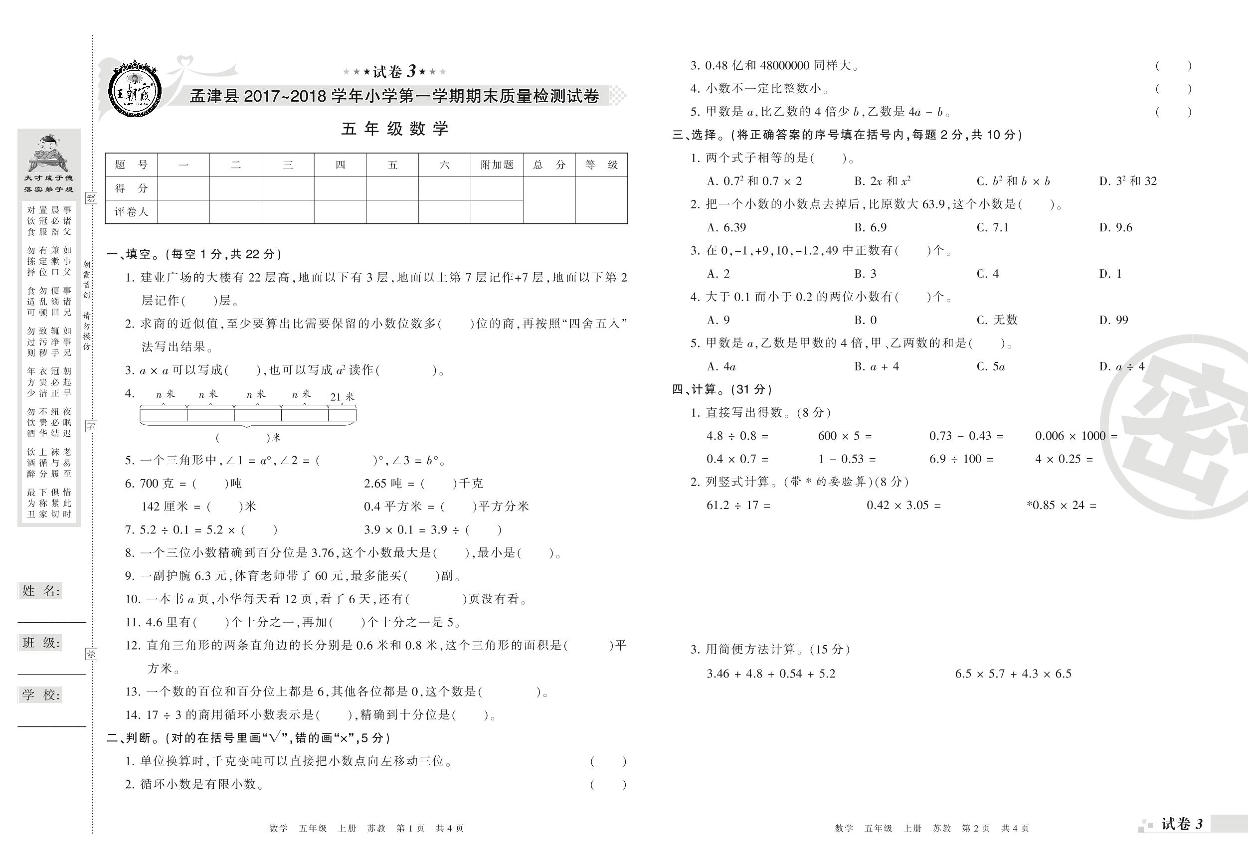 2017-2018学年第一学期洛阳市孟津县五年级数学试卷(苏教版)【3】