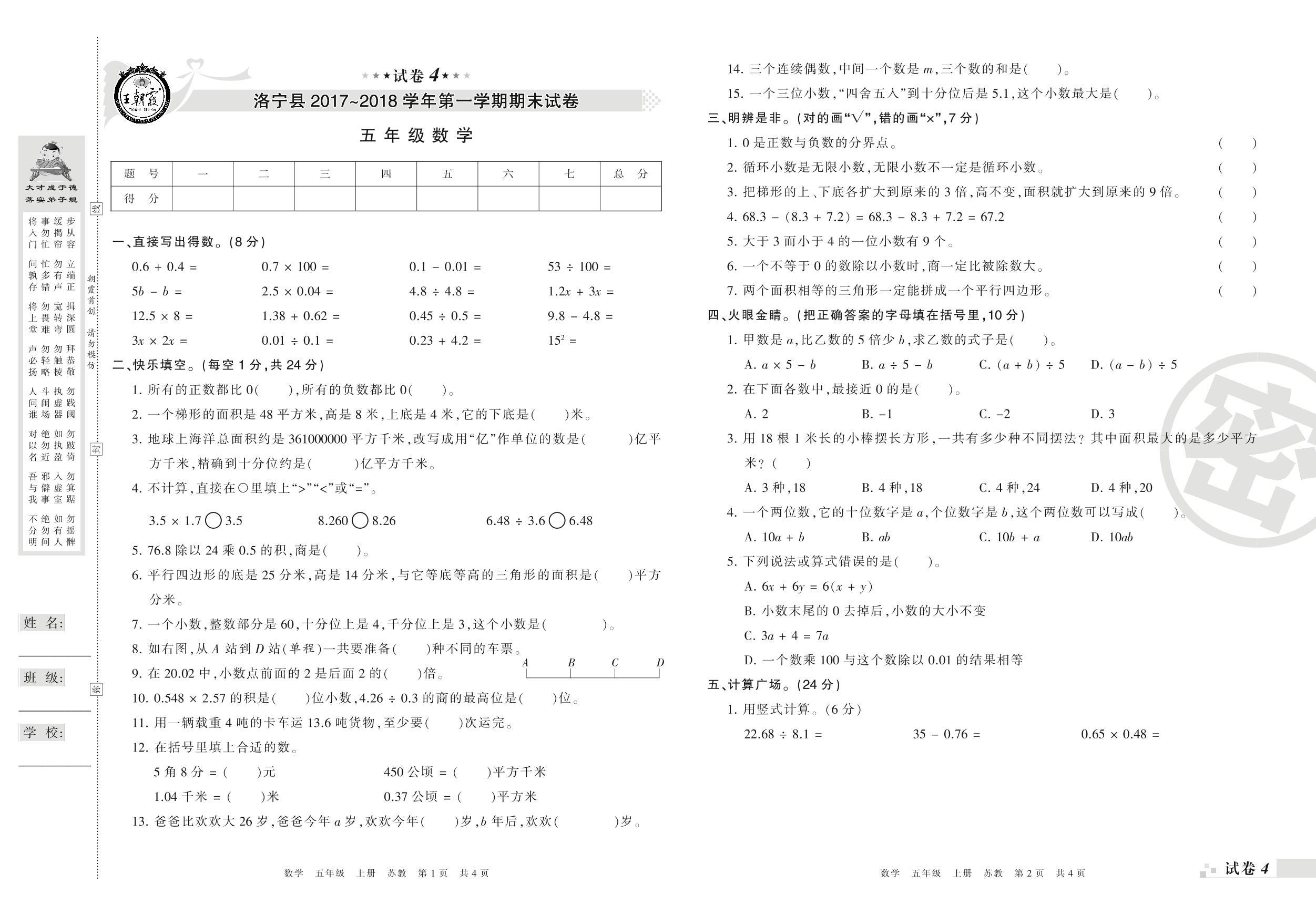 2017-2018学年第一学期洛阳市洛宁县五年级数学试卷(苏教版)【4】