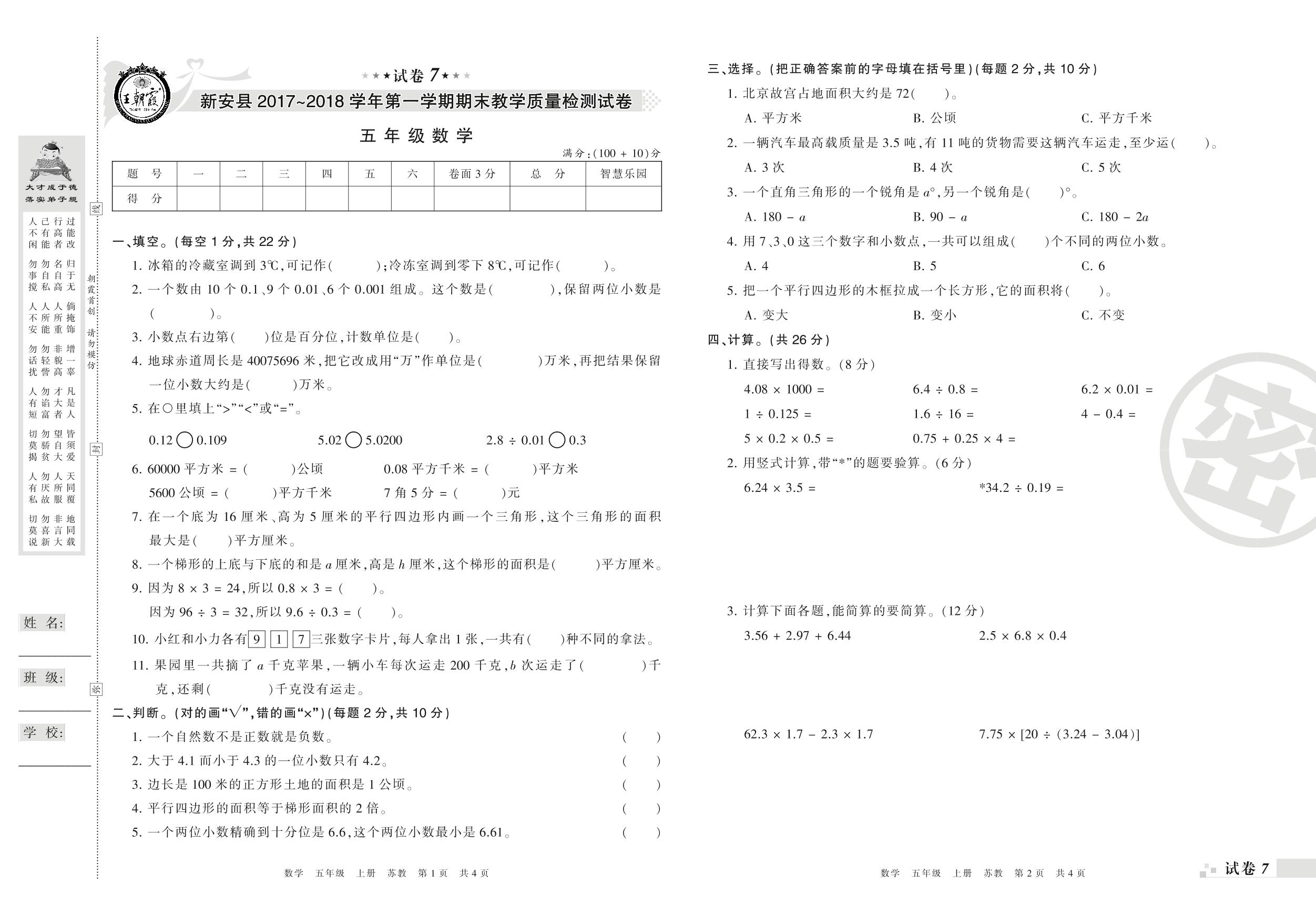 2017-2018学年第一学期洛阳市新安县五年级数学试卷(苏教版)【7】